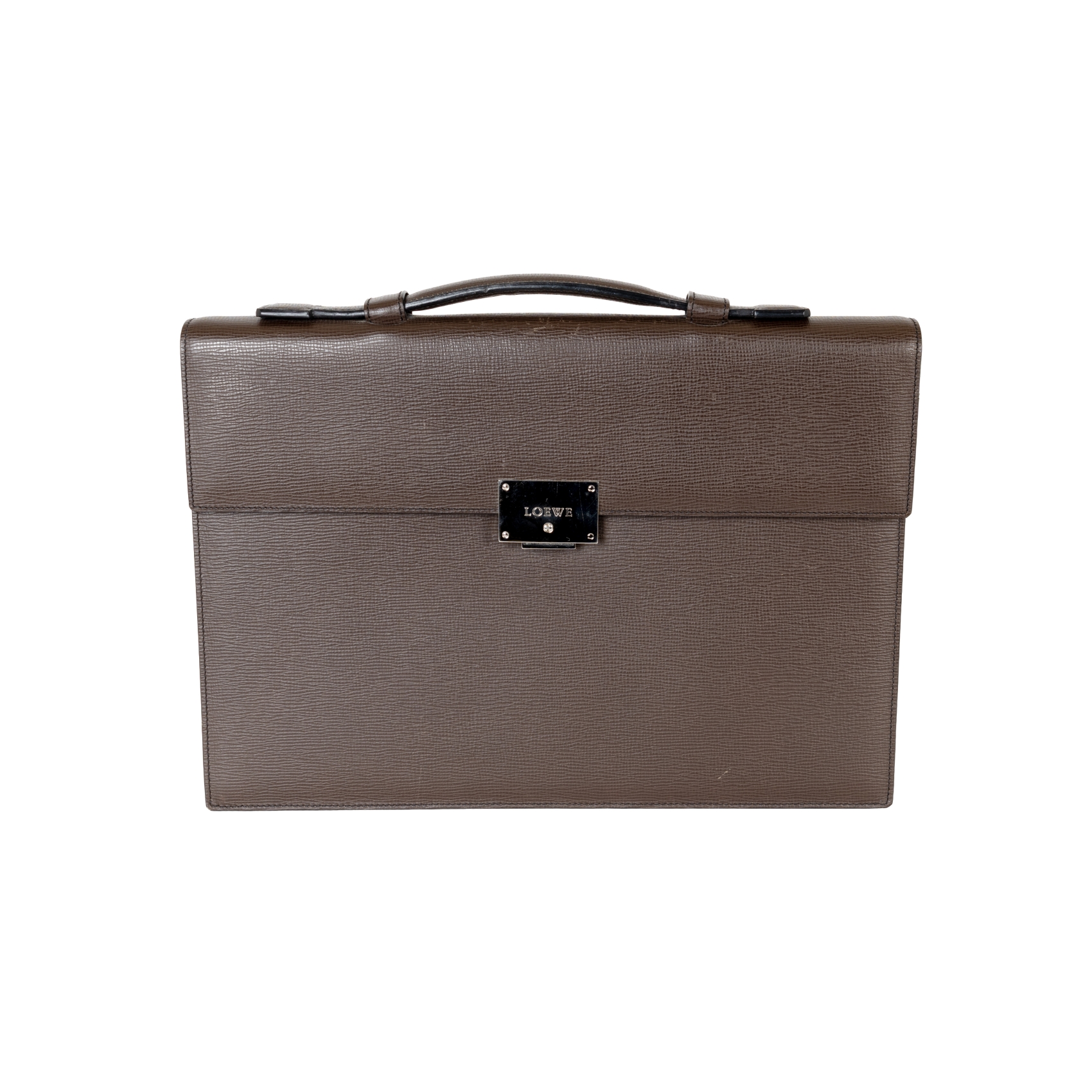 LOEWE. Maletín de caballero en cuero texturado de tonalidad marrón chocolate con solapa de cierre «push lock» con llave. Interior compartimentado. Nuevo. Adjunta llave, funda dustbag, estuche y bolsa originales.