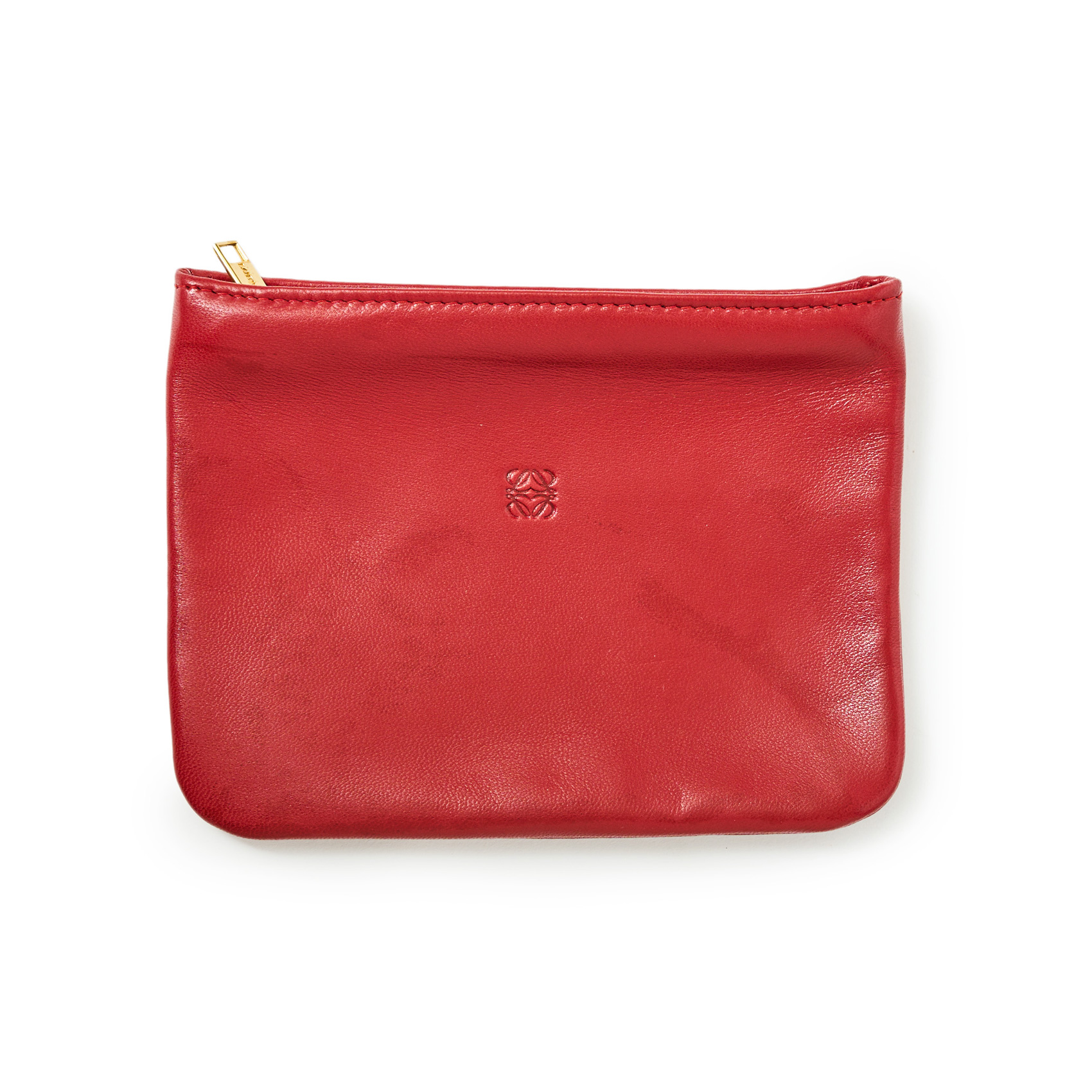 LOEWE. Monedero en cuero ovino de tonalidad roja con cierre de cremallera y logotipo de la firma grabado en relieve. Adjunta certificado de composición. En perfecto estado. Presenta ligera mancha de humedad.