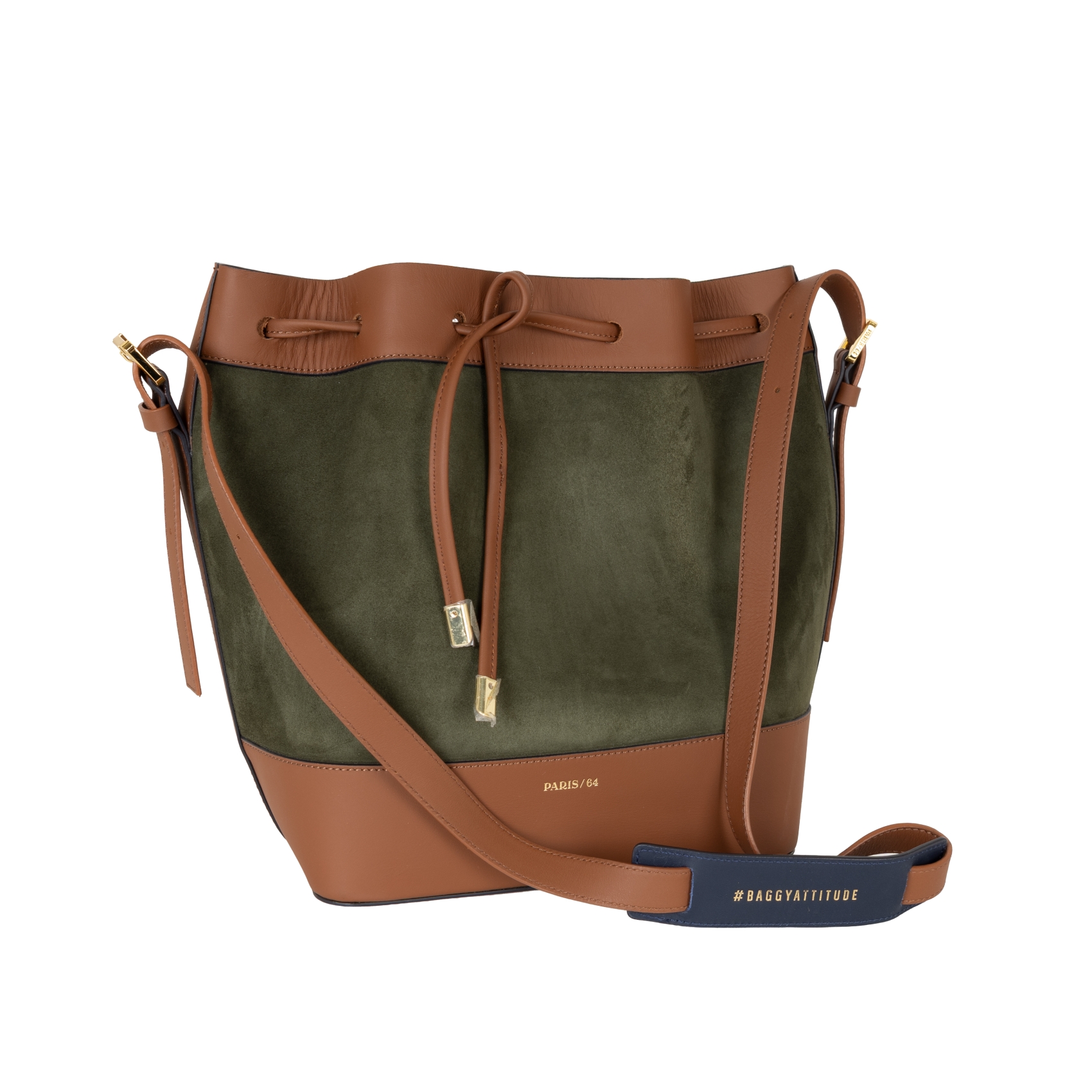 PARIS 64. Bolso modelo «Always» en piel de tonalidad marrón camel y ante verde oliva con cierre superior de cordón. Hebillas y herretes en metal dorado. Nuevo a estrenar. Adjunta funda dustbag original.