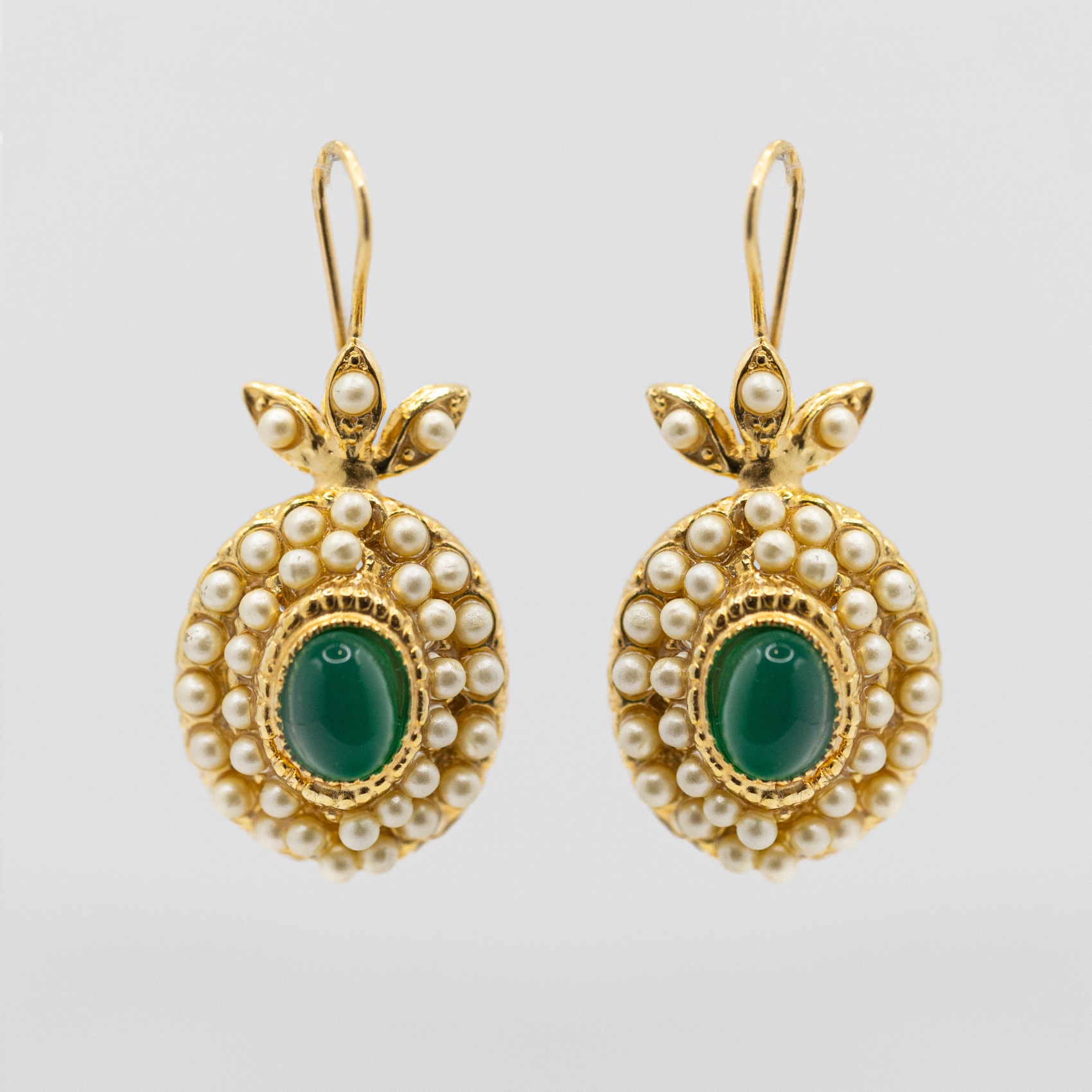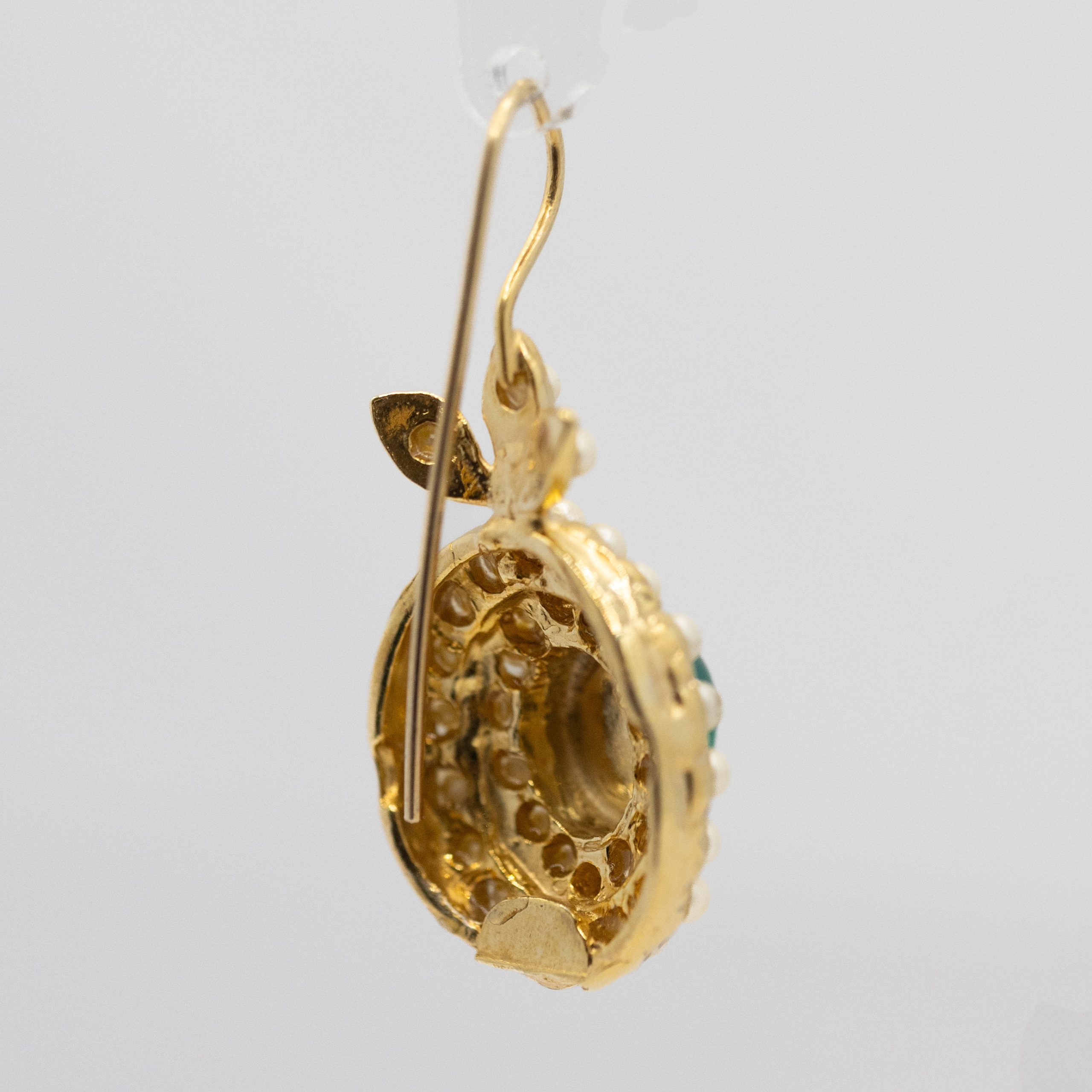 Pendientes rosetón en plata dorada con cabujón oval de símil de esmeralda orlado por perlas de aljofar, 4 cm.