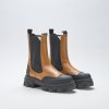 GANNI. Botas modelo «Cleated Low Chelsea» de media caña en piel reciclada de tonalidad marrón con paneles elásticos en laterales, detalles en puntera y suela de goma con tacos. En perfecto estado.