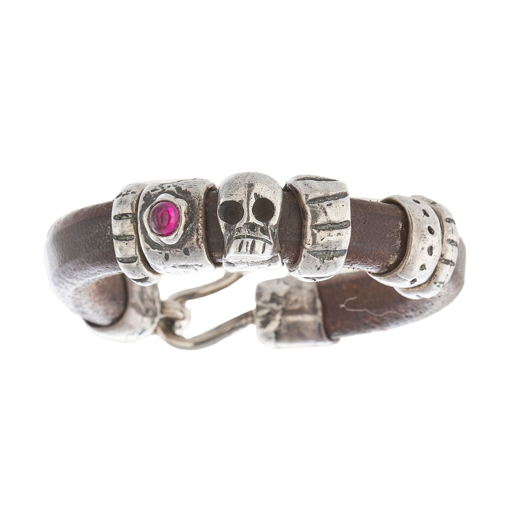 PLATA DE PALO. Pulsera en cuero marrón y plata con calavera y cabujón de símil de rubí.