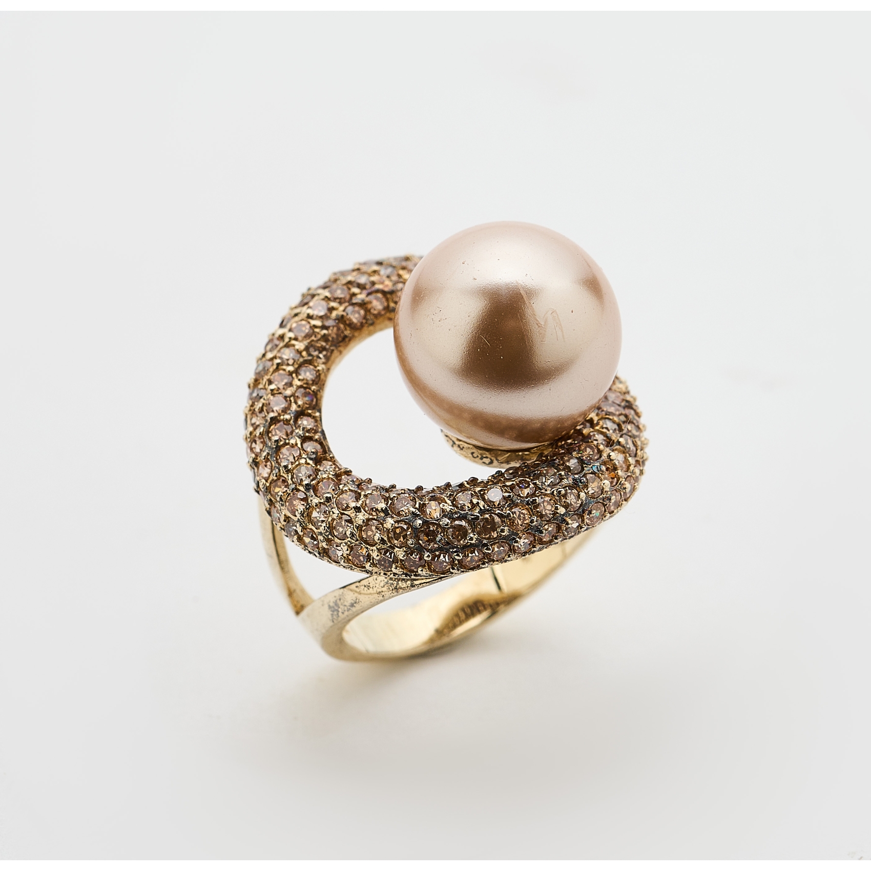Sortija en plata dorada con perla majórica golden de 13 mm. y circonitas brown.