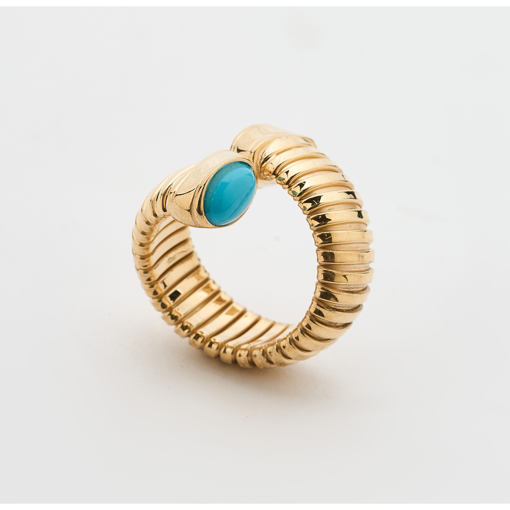 Sortija tubogas en plata dorada con centro abierto y finales rematados por cabujones ovales de turquesa.