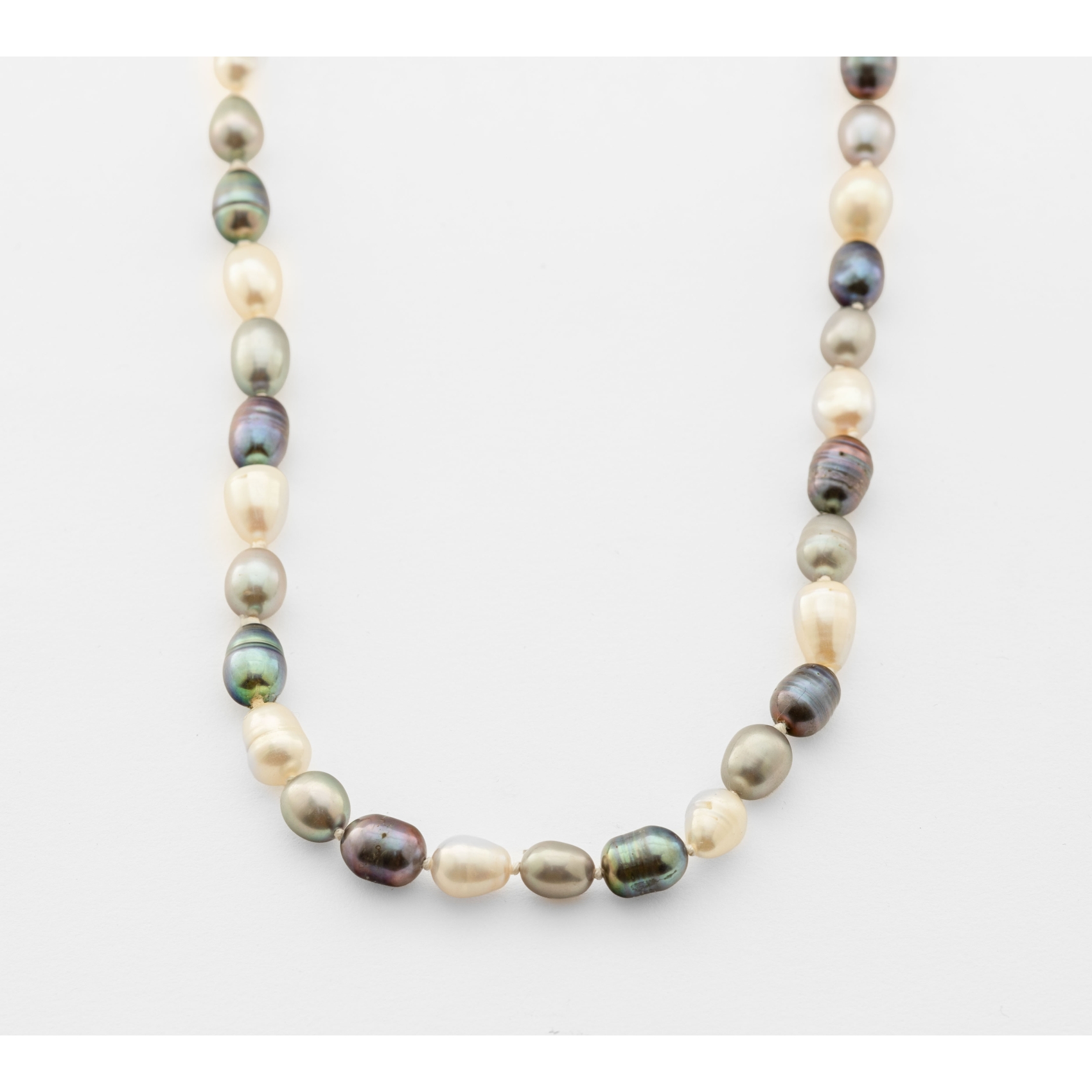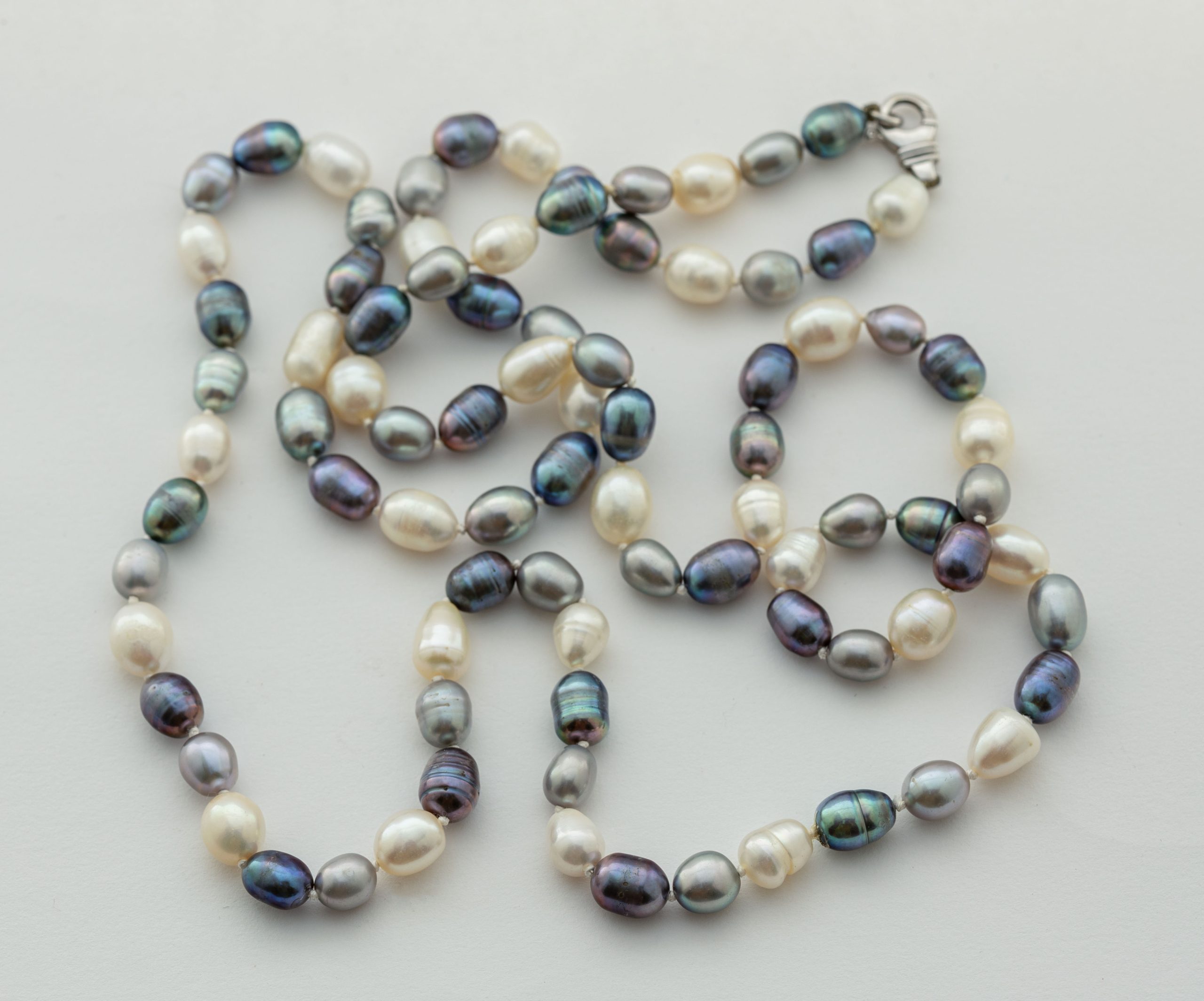 Collar de perlas cultivadas de agua dulce 7 – 10,5 mm. en color blanco y en dos tonos de gris, ceniza y marengo. Cierre mosquetón en plata.