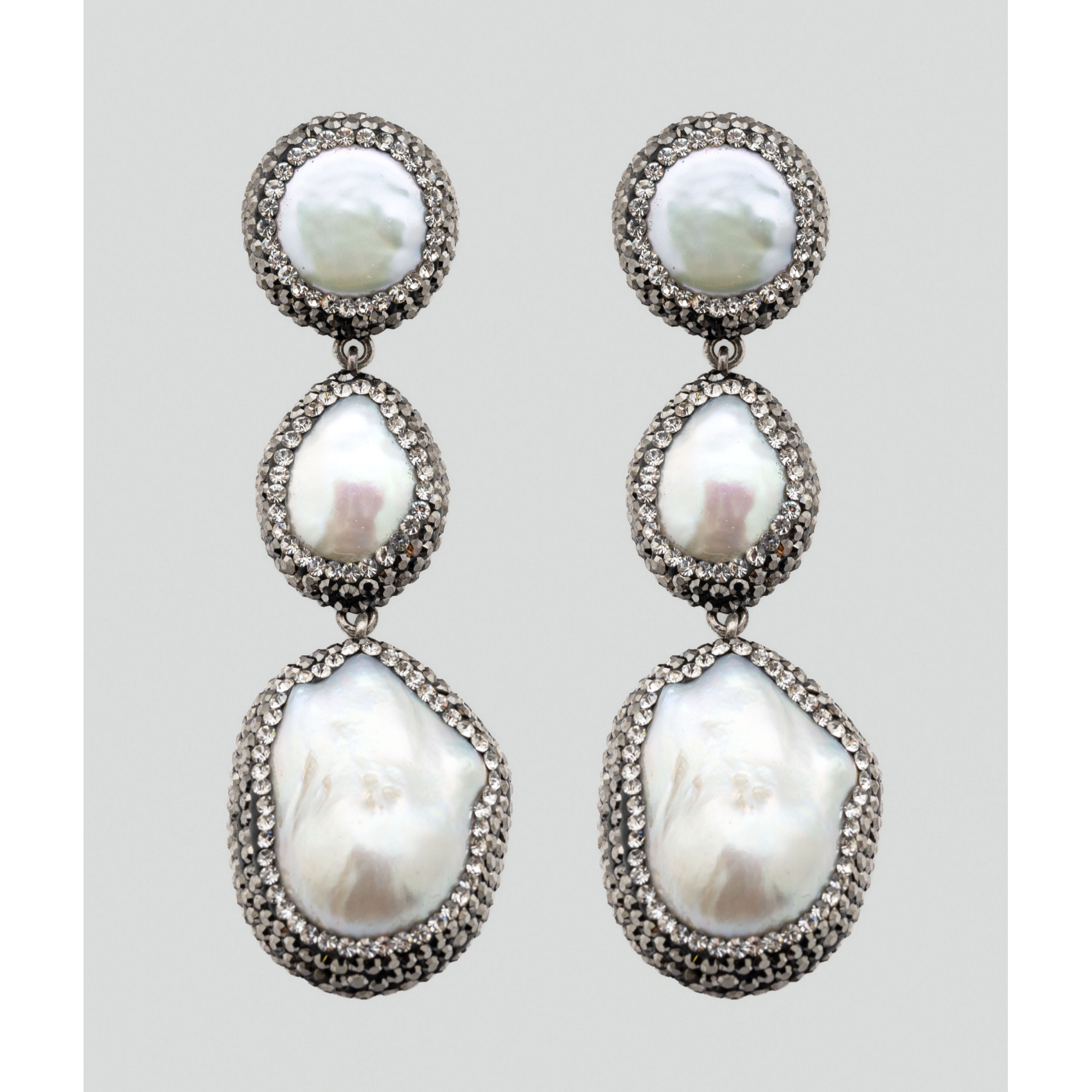 Pendientes largos en plata con perlas cultivadas botón 12 mm, y barrocas 13 x 9 y 24 x 17 mm. orladas por circonitas y marquesitas, 8 cm. Estimación:350 – 480€