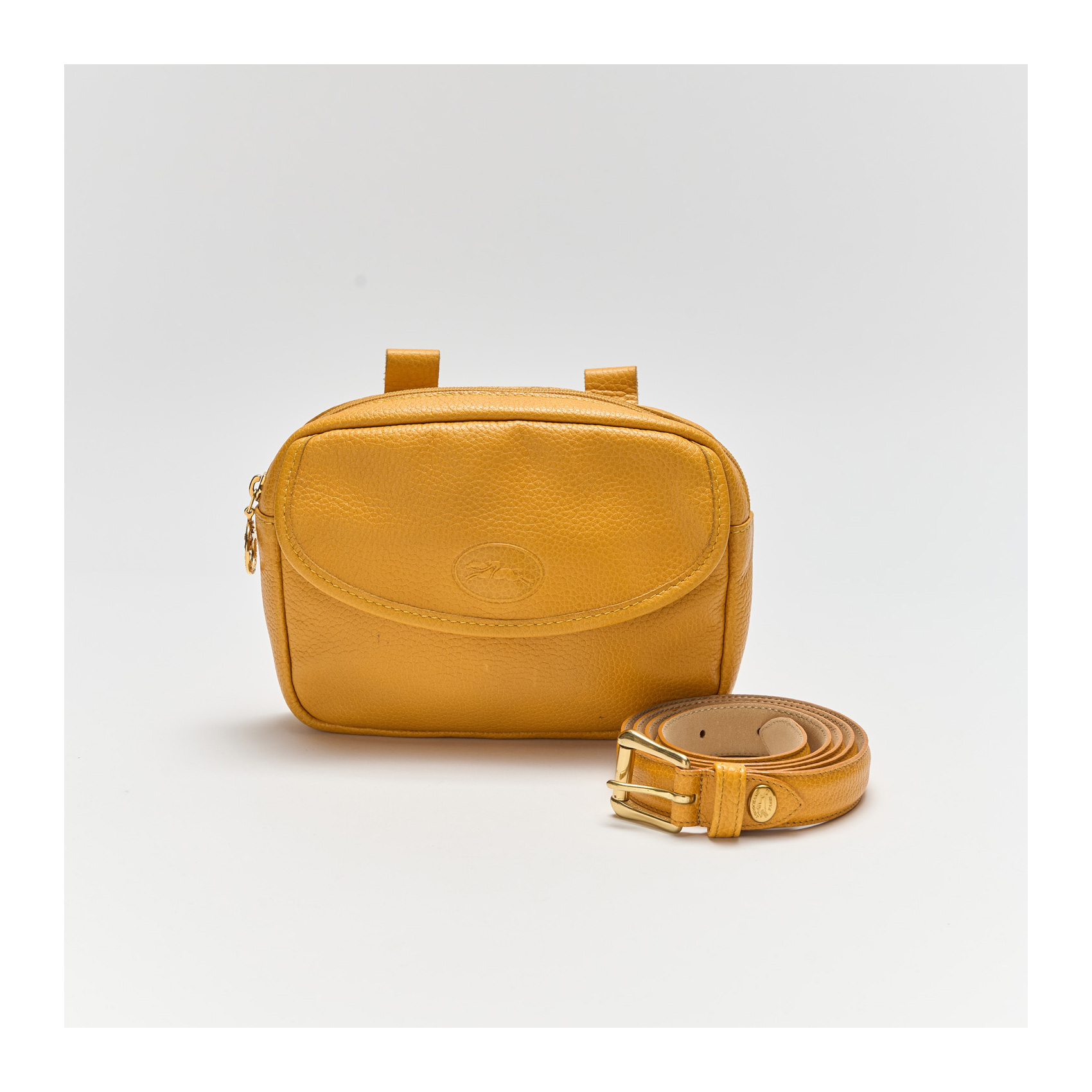 LONGCHAMP. Bolso-riñonera en cuero de tonalidad amarillo mostaza con cierre superior de cremallera y frente con bolsillo de solapa. En muy buen estado. Presenta ligeros signos de uso.