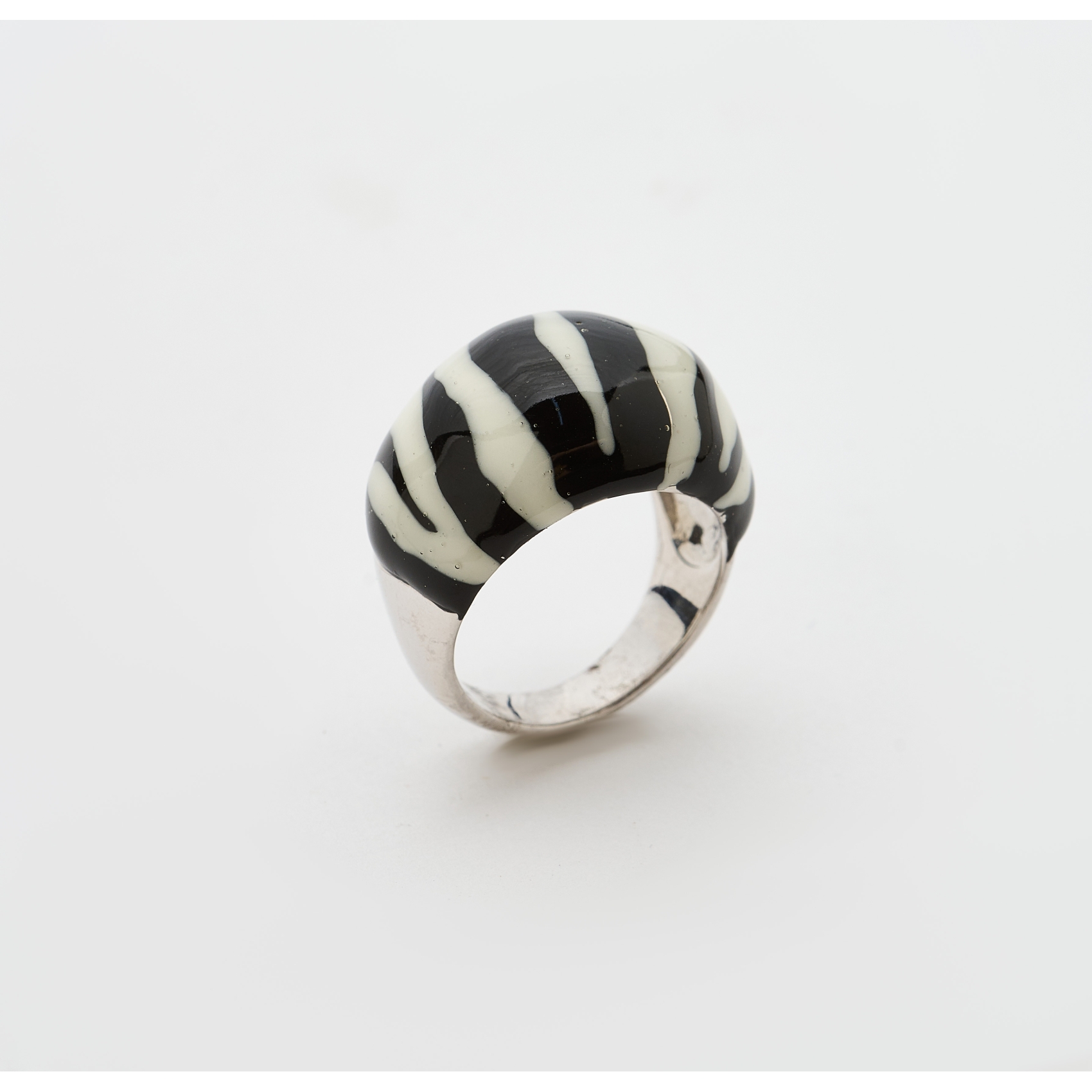 Sortija bombé en plata rodiada con esmalte animal print en blanco y negro.