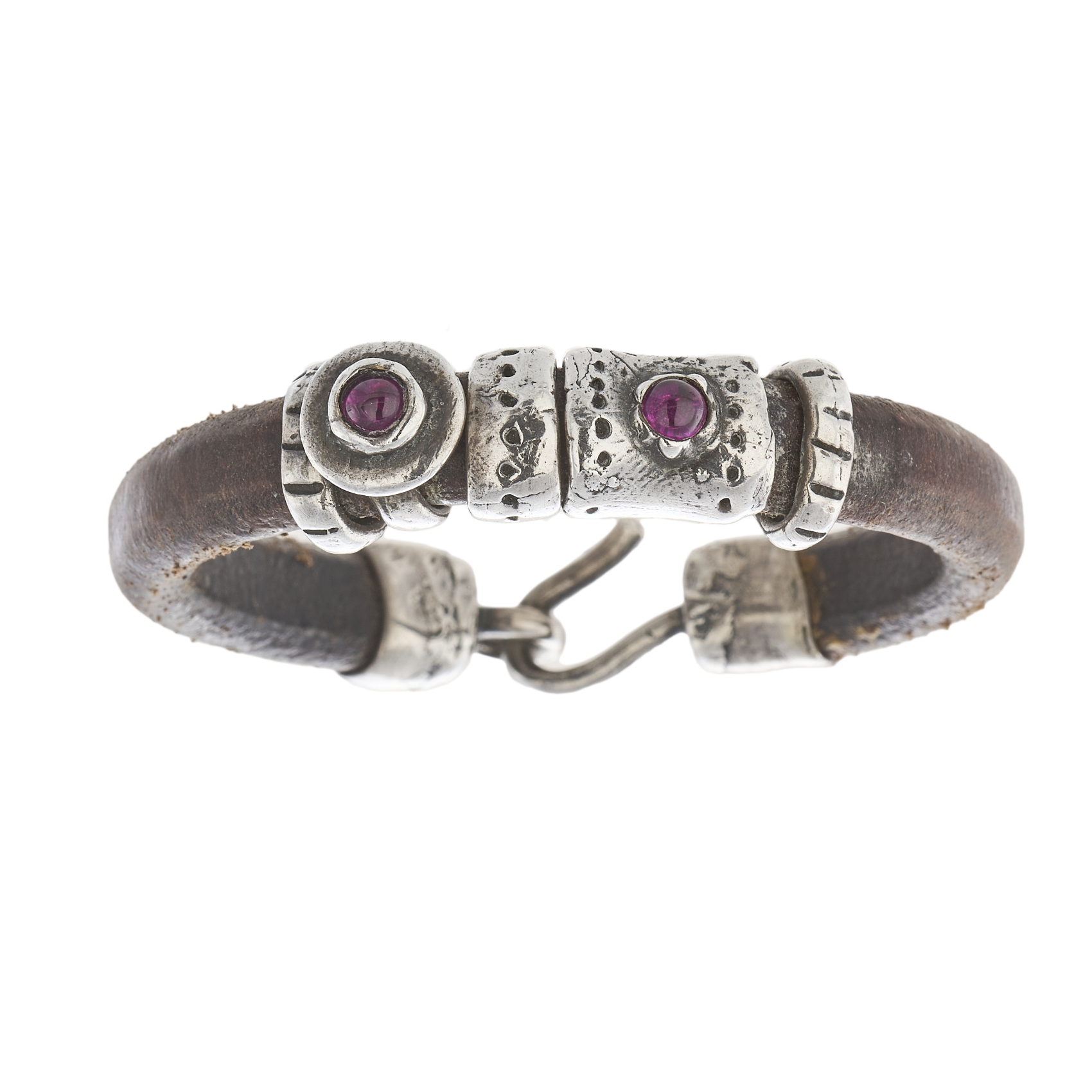 PLATA DE PALO. Pulsera en cuero marrón, y plata con dos cabujones de símil de rubí.