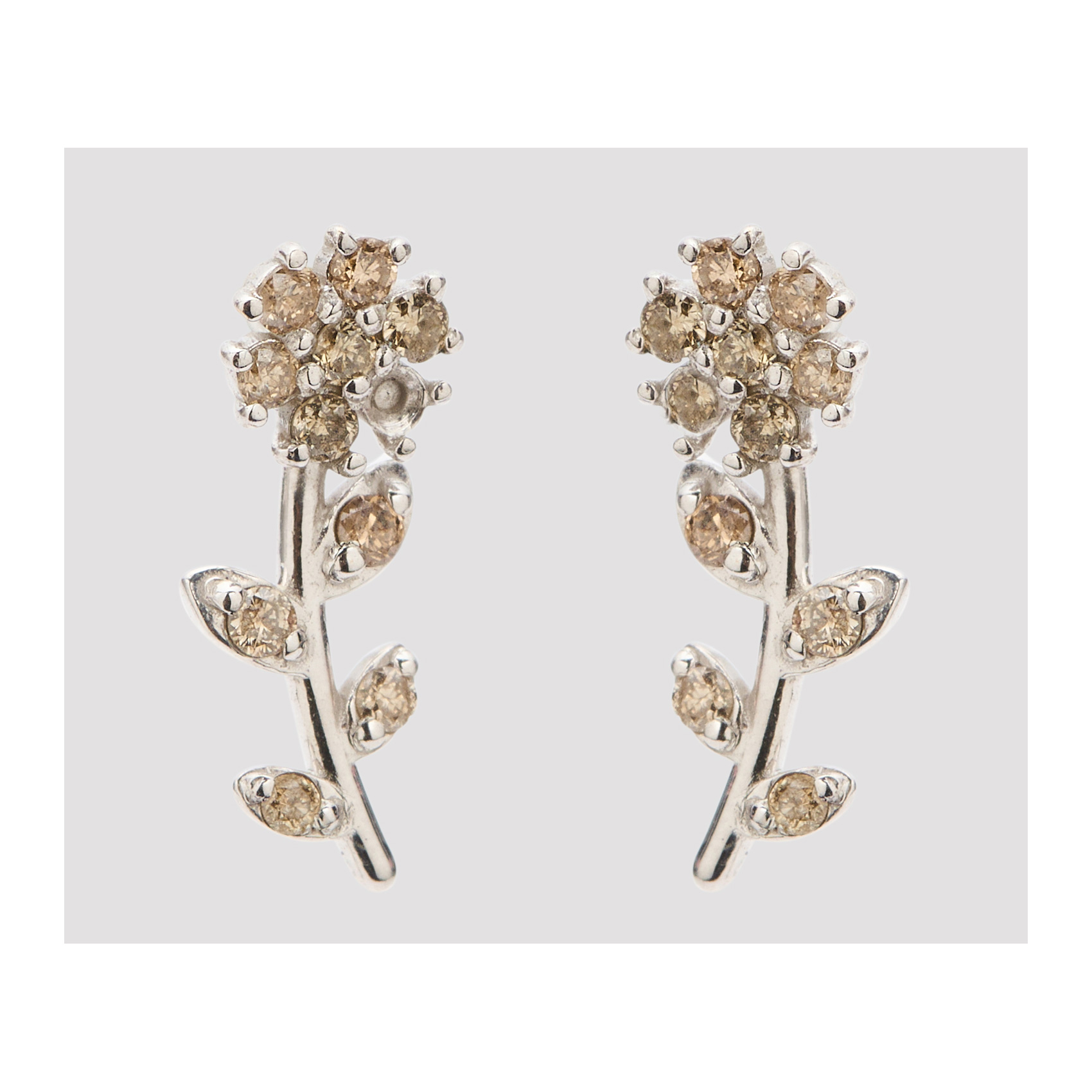 Pendientes diseño flor en oro blanco con diamantes brown talla brillante, 1 cm.