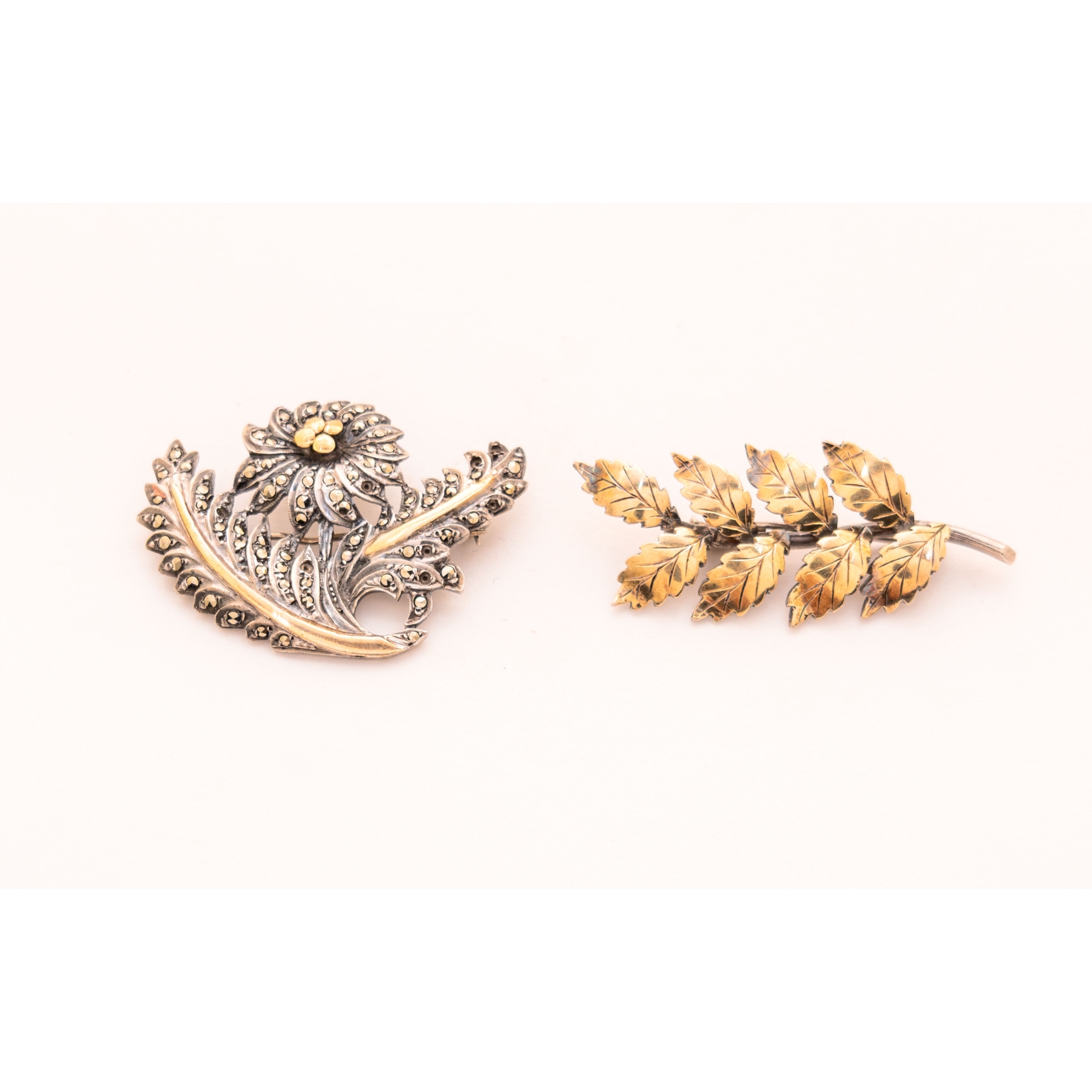 Dos broches diseños flor 4,5 x 3,6 cm. y hojas 5,3 cm.en plata y vistas en plata dorada, el floral con marquesitas. Estimación:280 – 350€