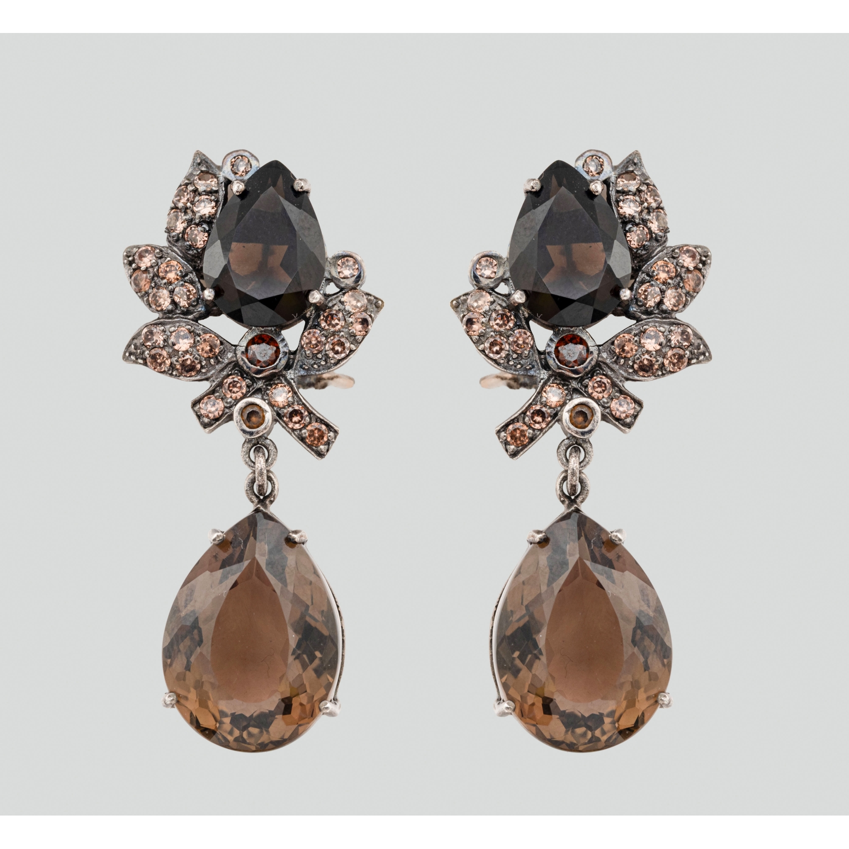 Pendientes largos en plata pavonada con cuarzos fumé tallas redonda y perilla de 18 x 10 y 20 x 15 mm. Estimación:300 – 400€
