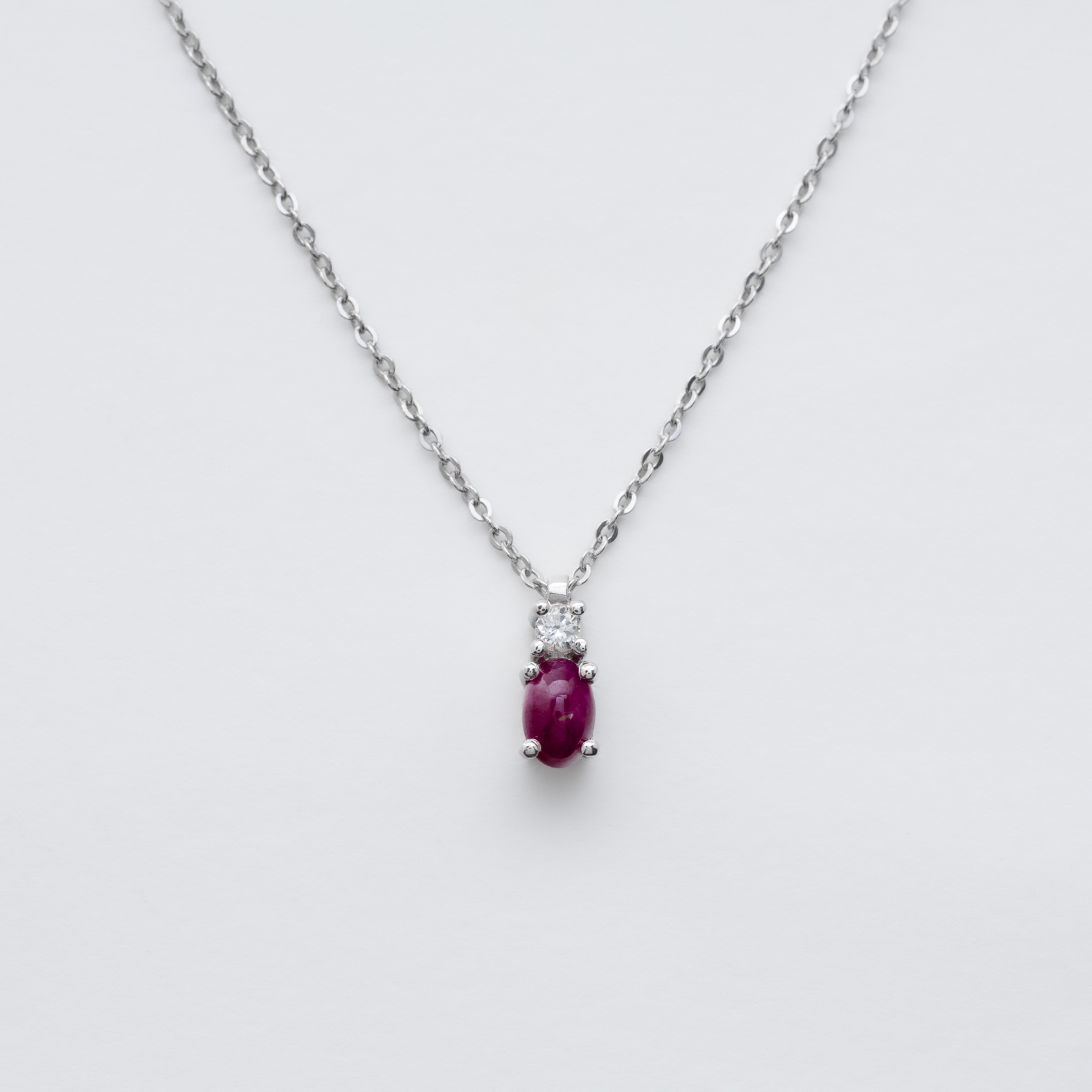 Gargantilla en plata rodiada con cabujón de rubí talla oval coronado por diamante talla brillante.