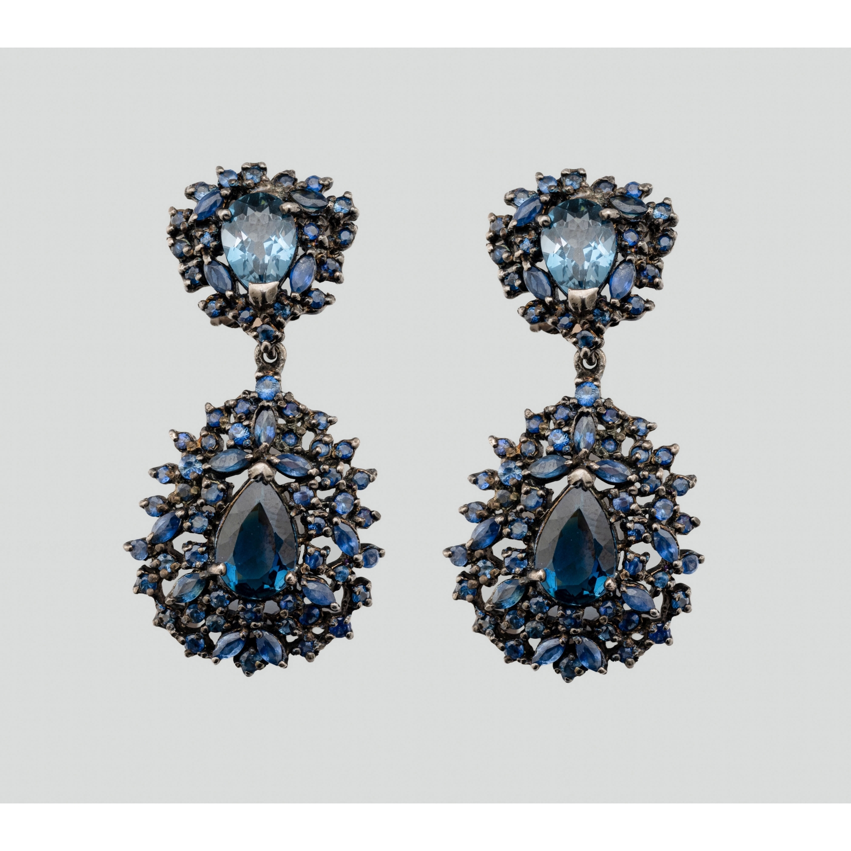 Pendientes largos en plata pavonada con topacios azules talla perilla de 11 x 7 y 12 x 8 mm y tanzanitas tallas redonda y marquise. Estimación:500 – 600€