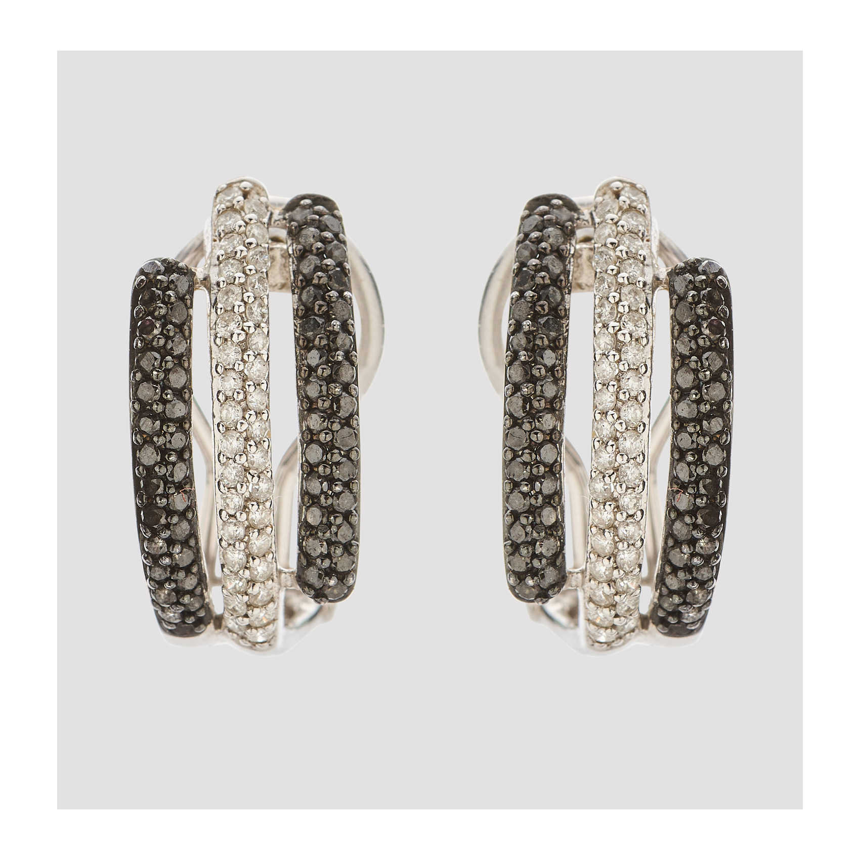 Pendientes media criolla calada en oro blanco 14K con tres bandas de pavé de diamantes talla brillante blancos y negros.