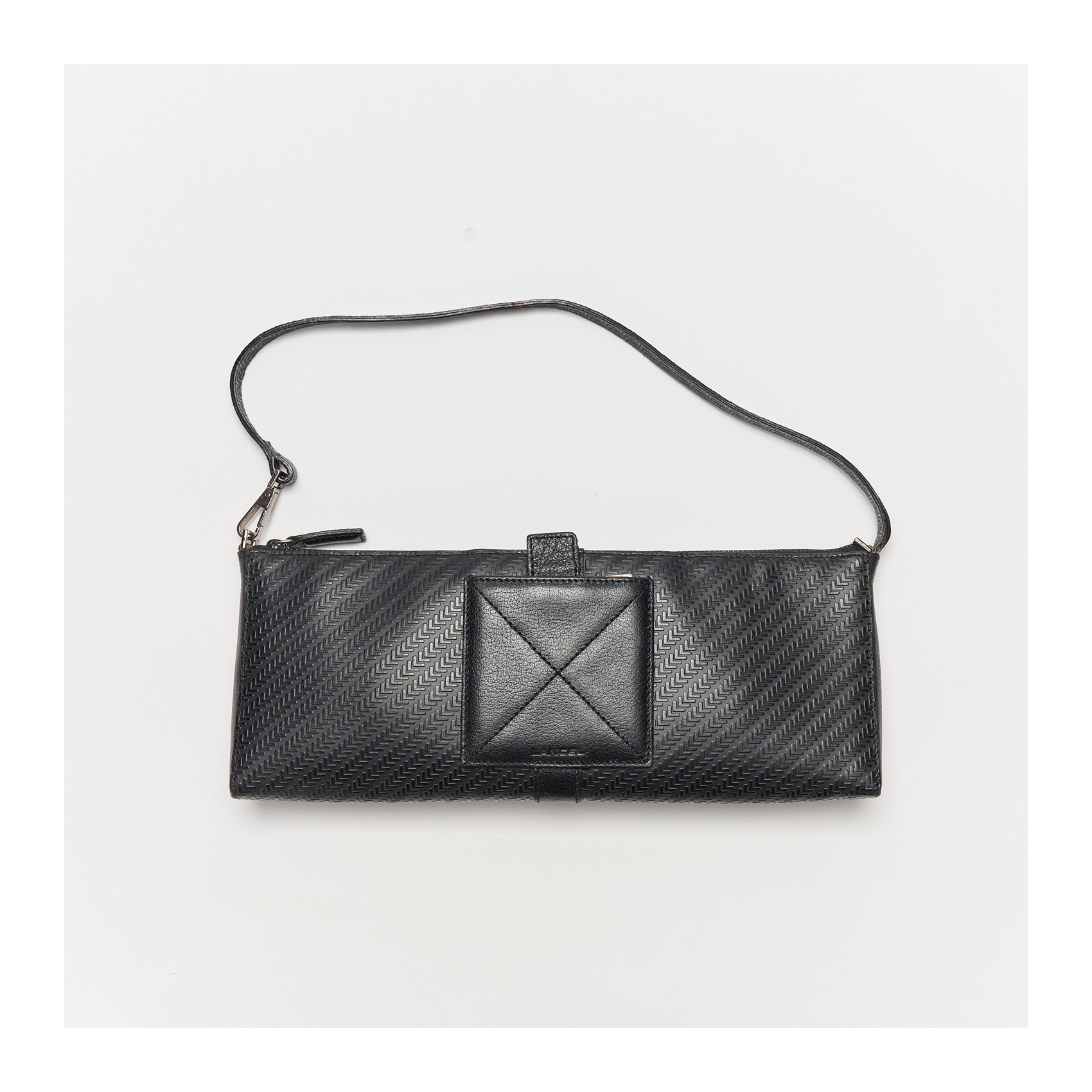 LANCEL. Bolso en piel de tonalidad negra con estampado texturizado de motivo geométrico con bolsillo exterior para espejo con lengueta. Interior con forro en rojo logotipado. En buen estado. Ajunta funda dustbag original. Presenta leve desperfecto un arranque de la correa y leves manchitas el espejo. Ref.:LFHG.