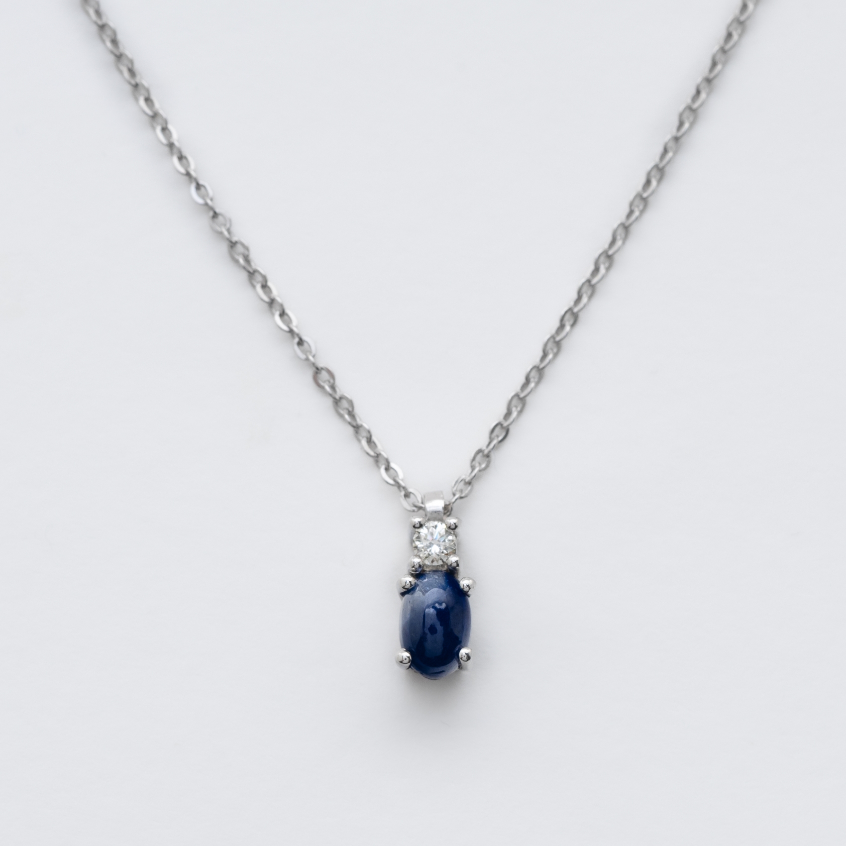 Gargantilla en plata rodiada con cabujón de zafiro azul talla oval coronado por diamante talla brillante.