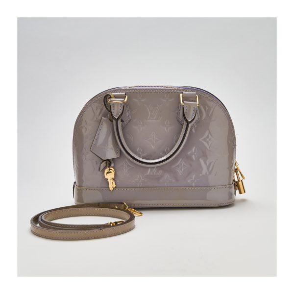 LOUIS VUITTON. Bolso modelo «Alma BB Monogram Vernis» en charol de tonalidad violeta con cierre de cremallera y candado con dos llaves. En buen estado. Presenta alteración del color. Ref.:AA0154.