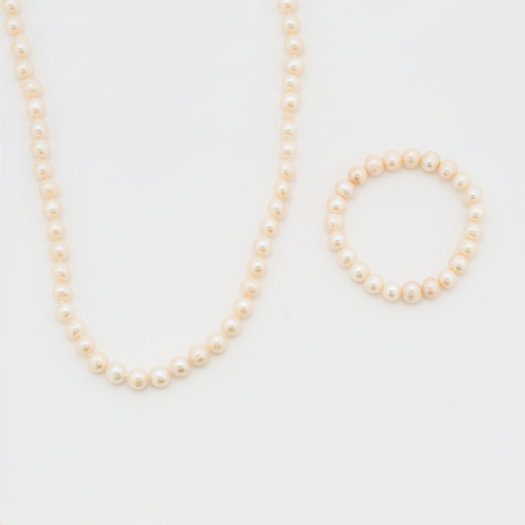 Collar y pulsera con perlas de agua dulce de 8-9 mm. El collar con cierre reasa en plata, la pulsera es elástica.