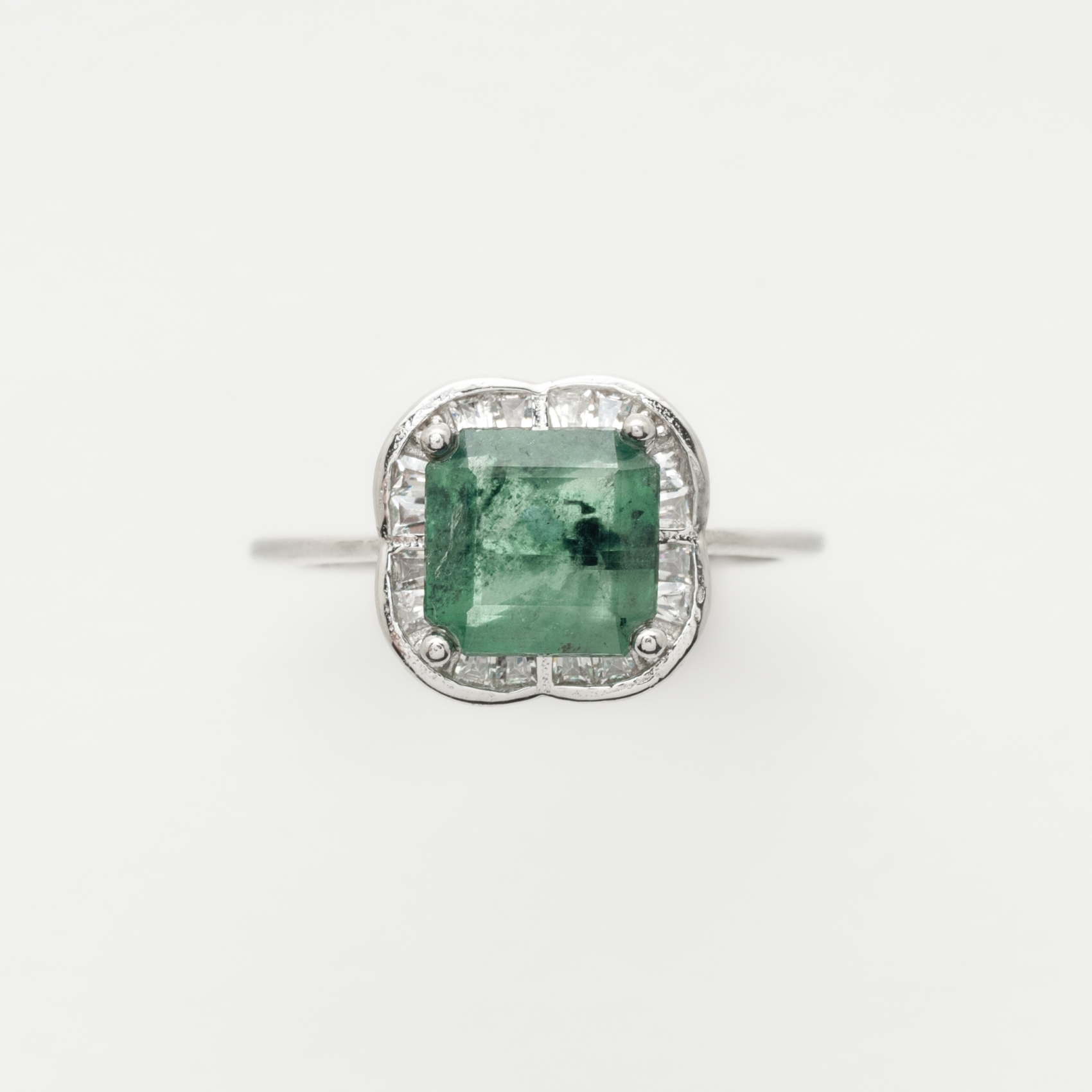 Sortija en plata con esmeralda talla octogonal orlada por circonitas talla trapecio.