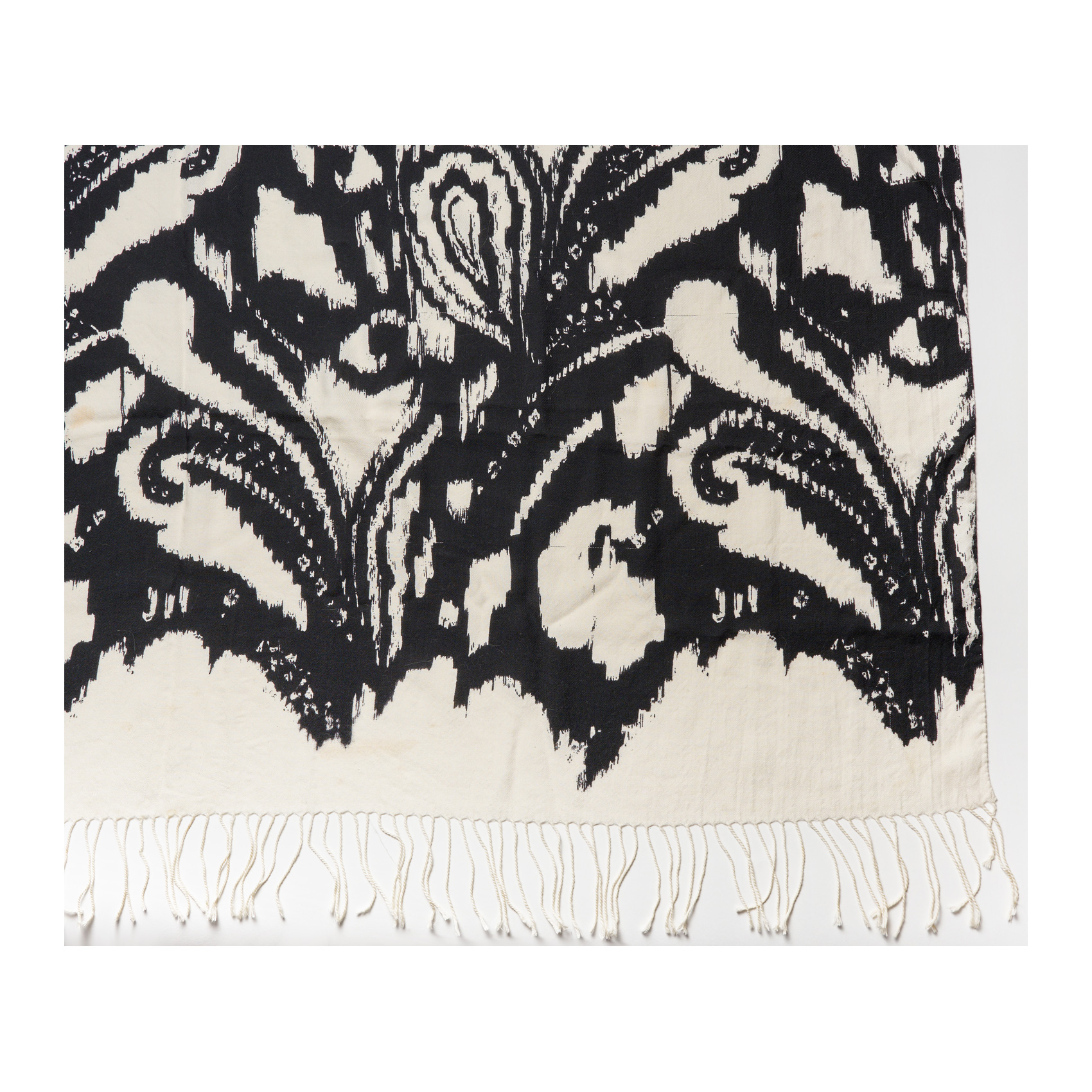 ETRO. Foulard en seda, lana y cashmere de tonalidad crema y negro con estampado de motivos vegetales y dos extremos rematados por flecos. En buen estado. Presenta algunas manchitas.