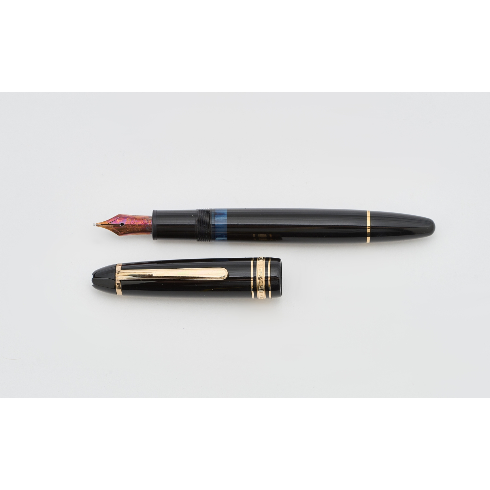 MONTBLANC «Meisterstück Nº146». Estilográfica en resina negra con detalles en plaqué oro. Plumín en oro 14K. Sistema de carga por pistón.