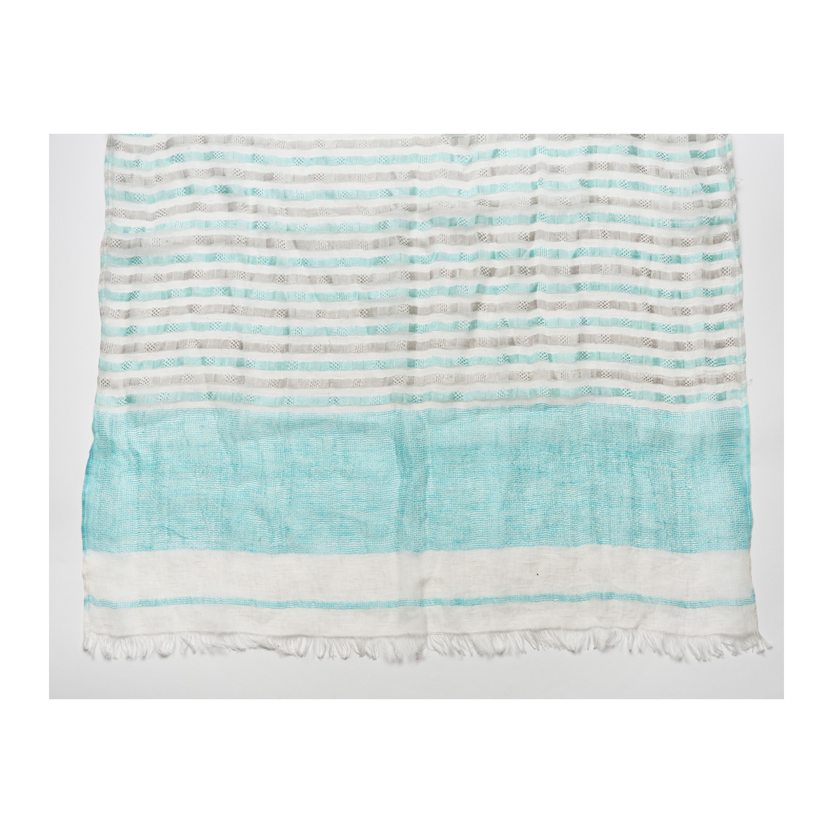 ARMANI. Foulard en lino y seda de tonalidad celeste con estampado de motivos lineales. En muy buen estado.