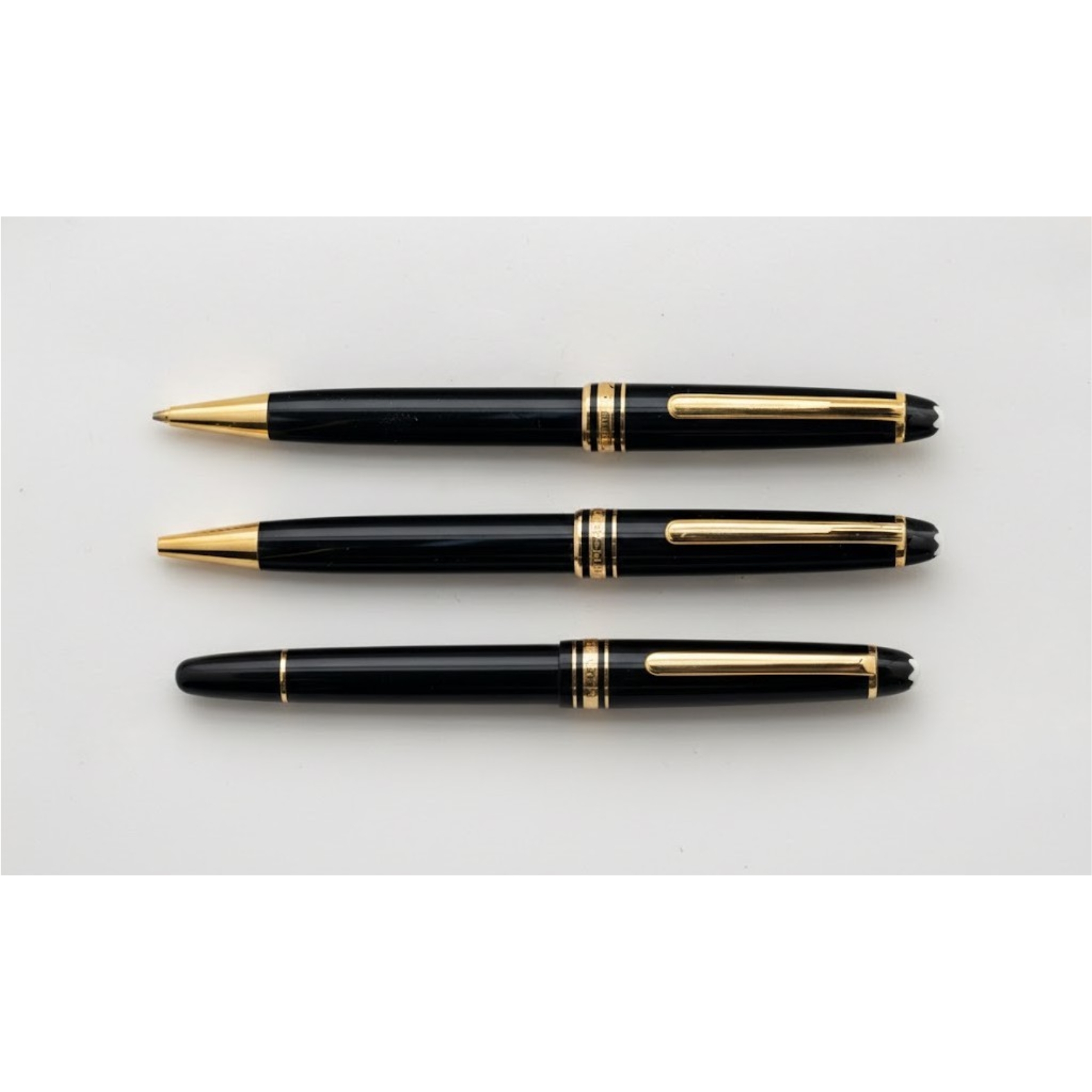MONTBLANC » Meisterstück. Juego de estilográfica, bolígrafo y lápiz en laca negra con detalles en plaqué oro. Plumín en oro 14K. Sistema de carga por pistón.