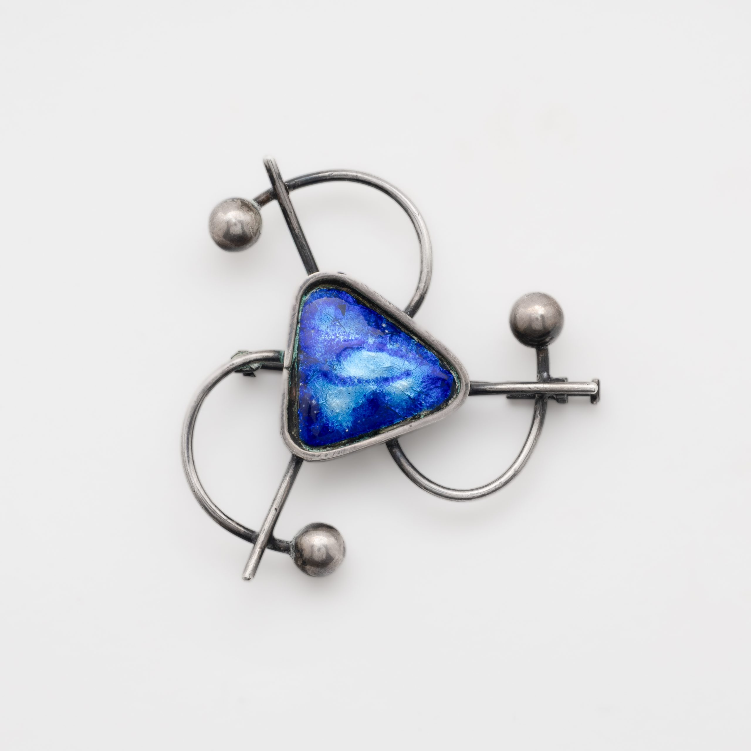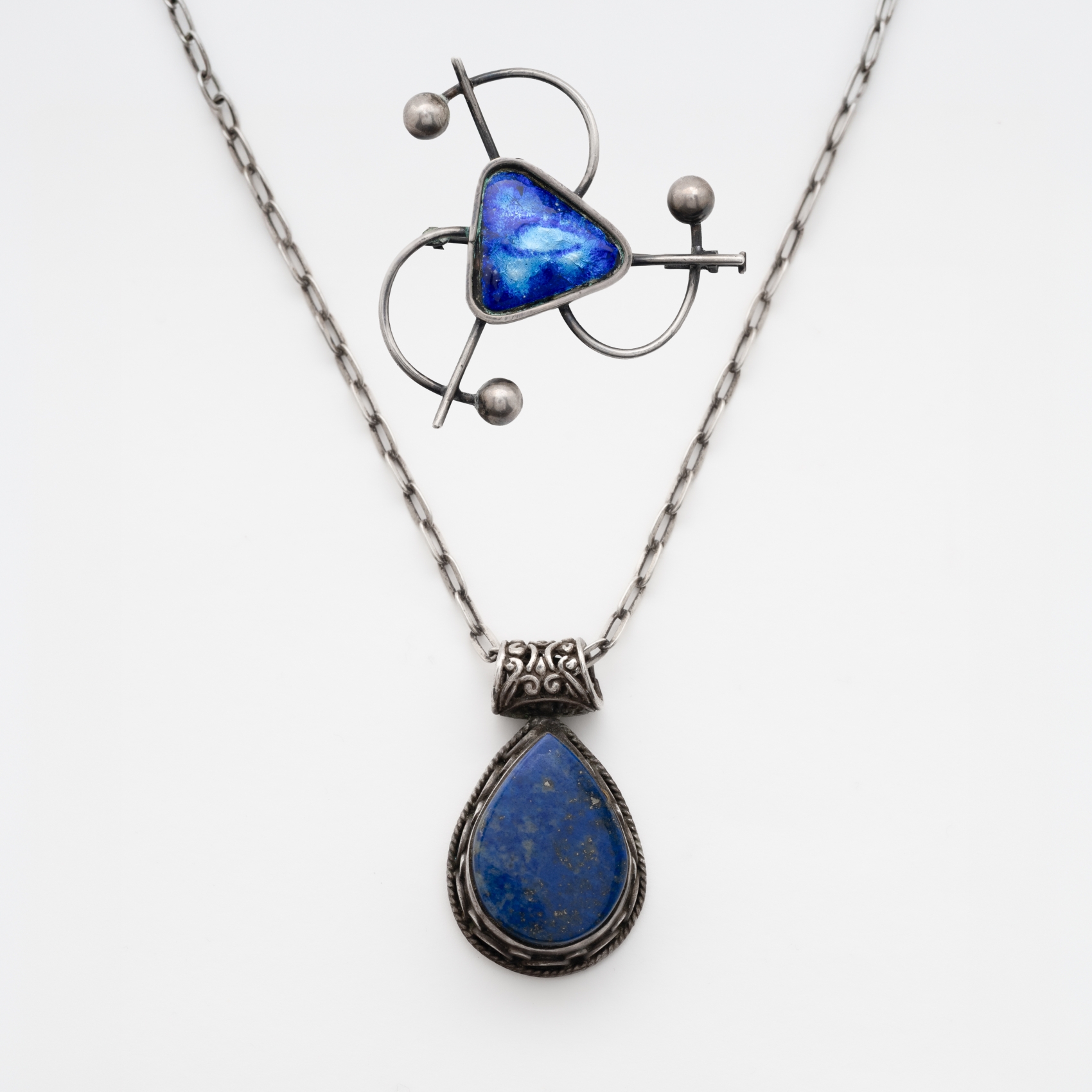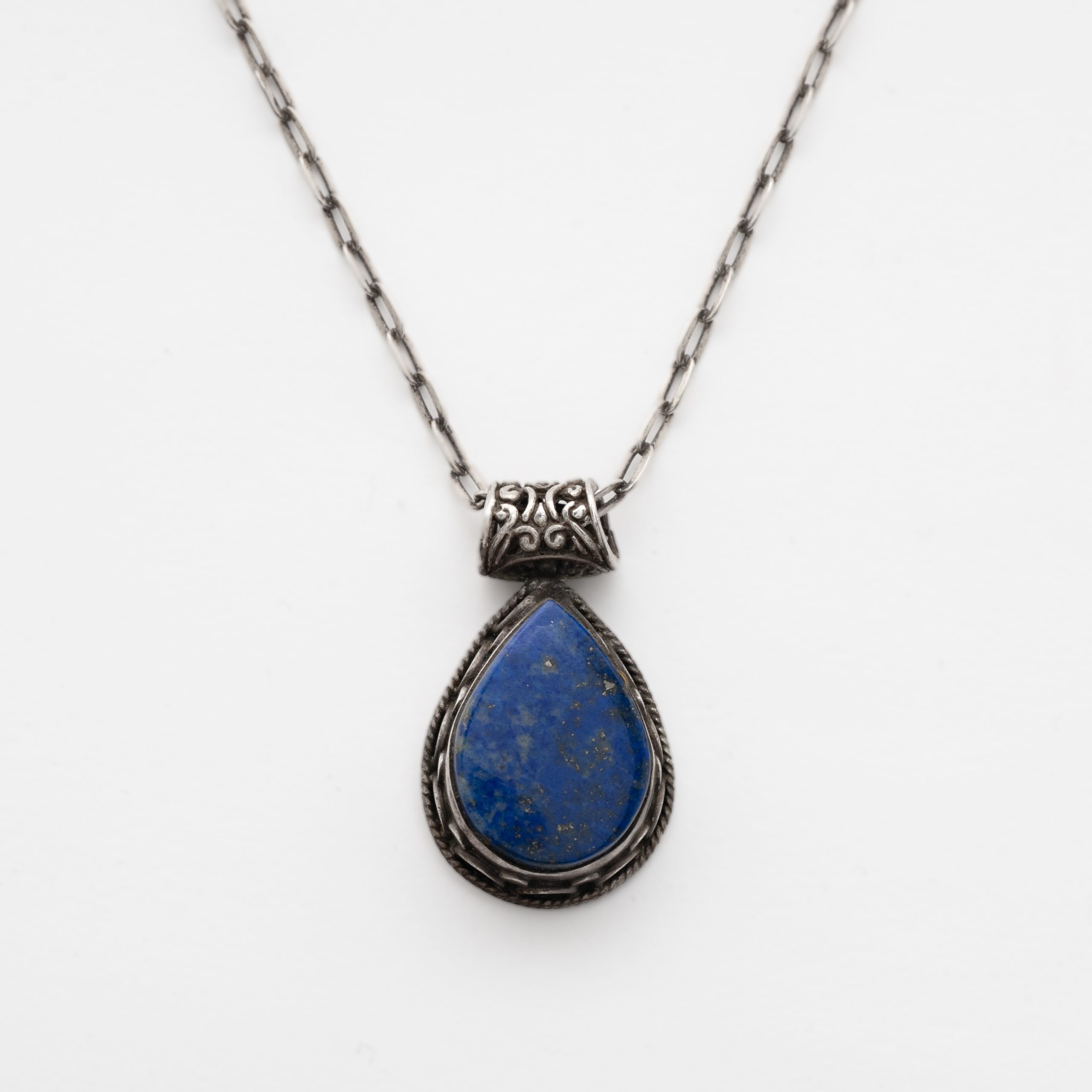 Cadena forjada y colgante labrado con aplicación de lapislázuli talla perilla de 21 x 16 mm y broche diseño aspas con triángulo central en esmalte azul.