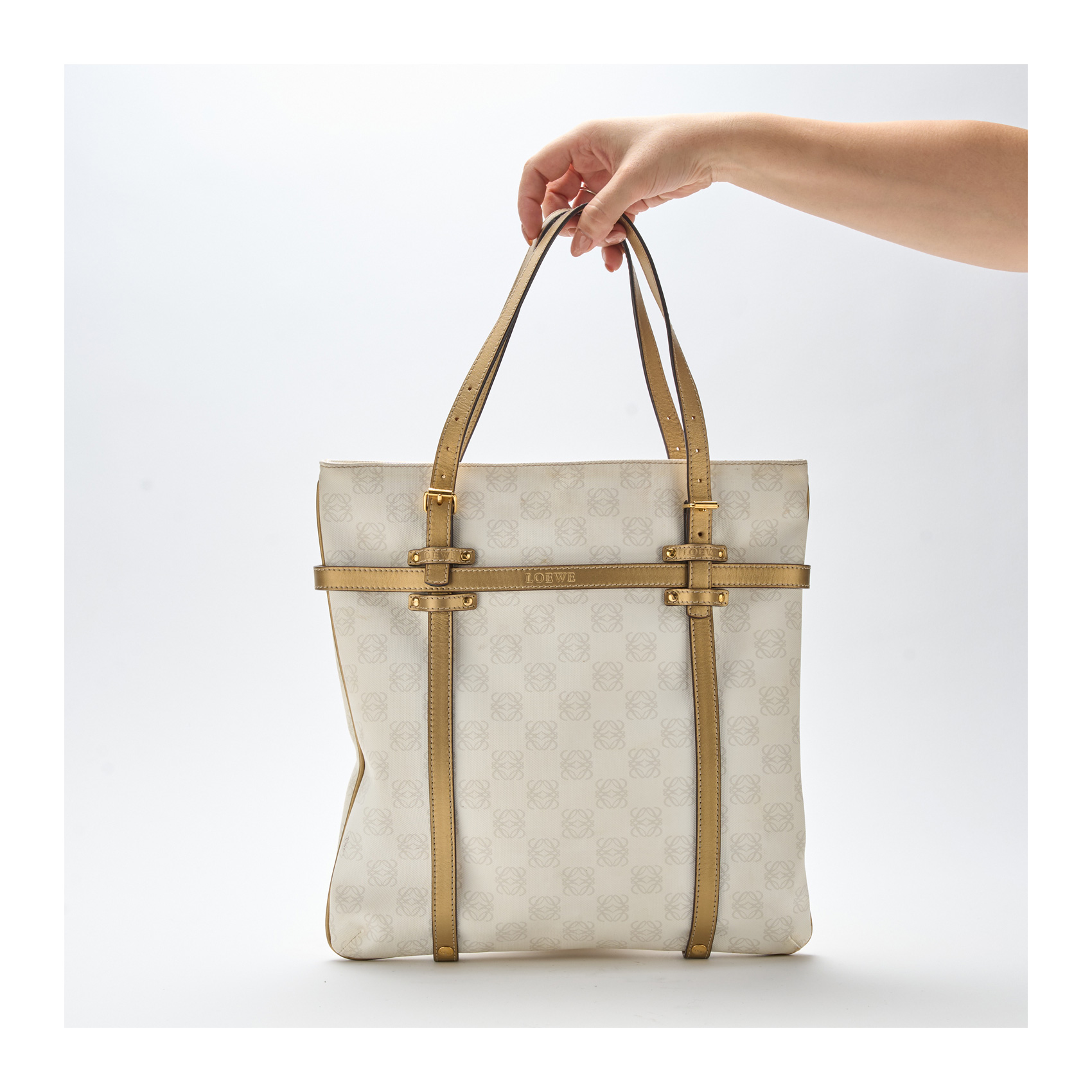 LOEWE. Bolso modelo «Anagram» en lona blanca y cuero dorado. Hebillas, remaches y cierre imantado en metal dorado. Adjunta funda dustbag original. En buen estado. Presenta leves manchas.