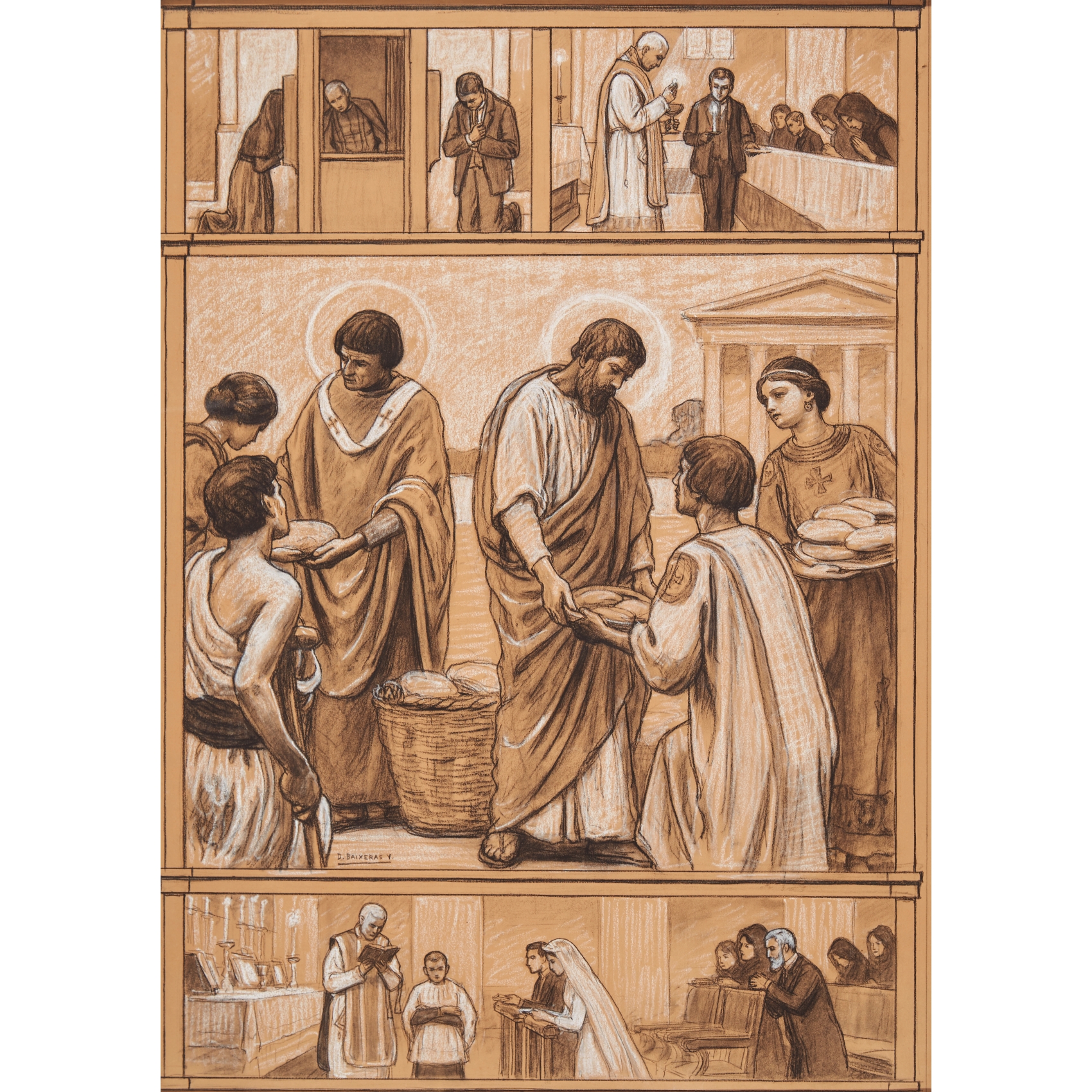 Dibujo a pastel y carboncillo sobre papel. Firmado.