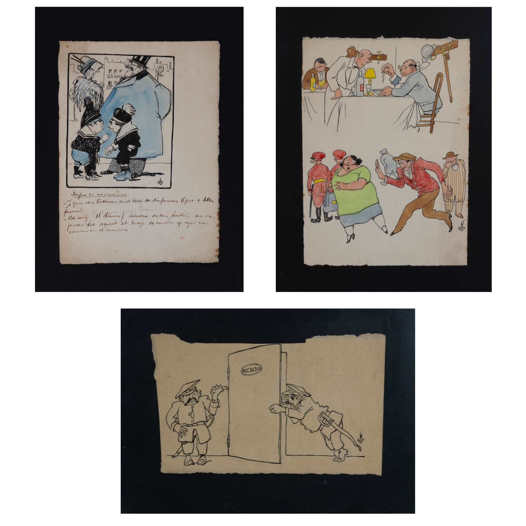 Lote de tres dibujos a tinta, plumilla y acuarela sobre papel. Firmados.