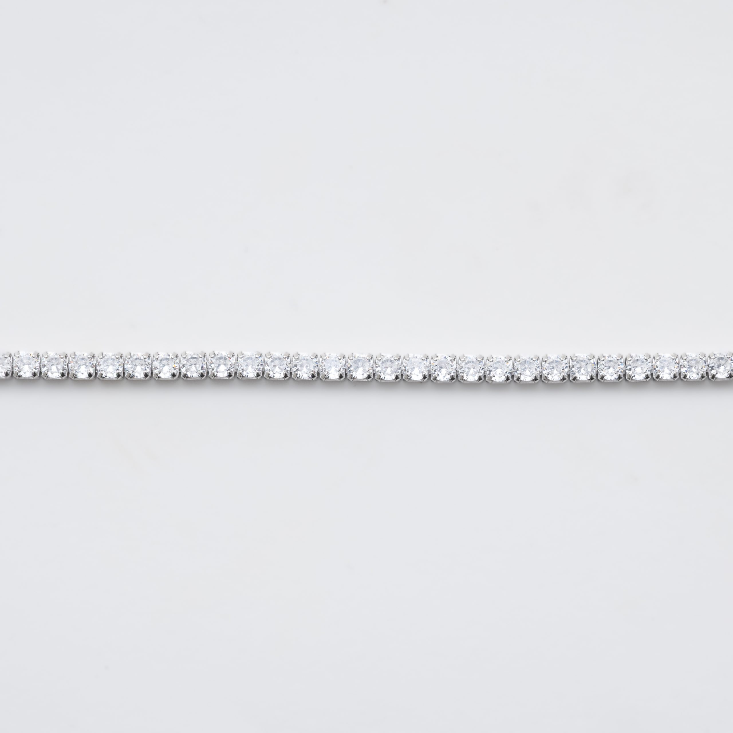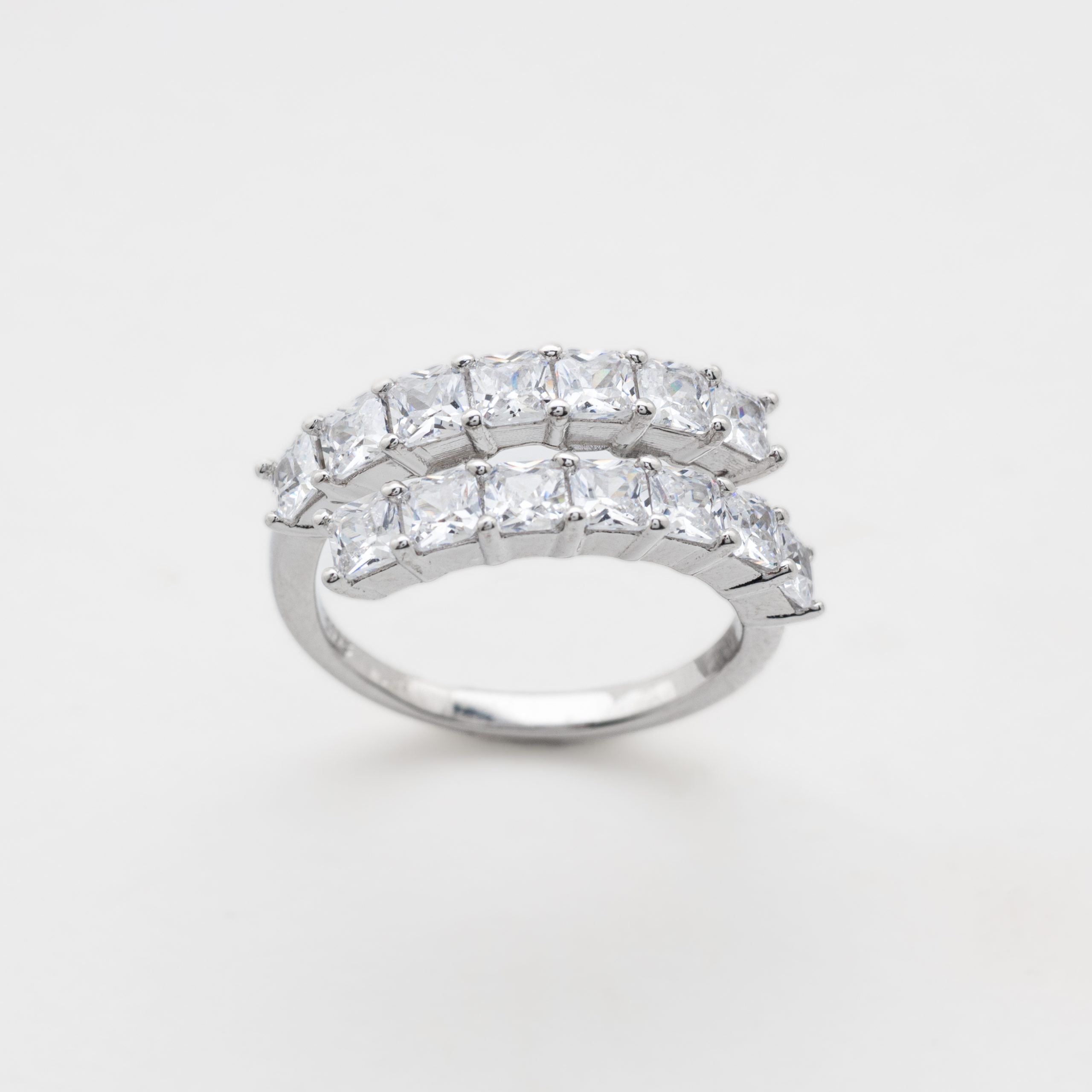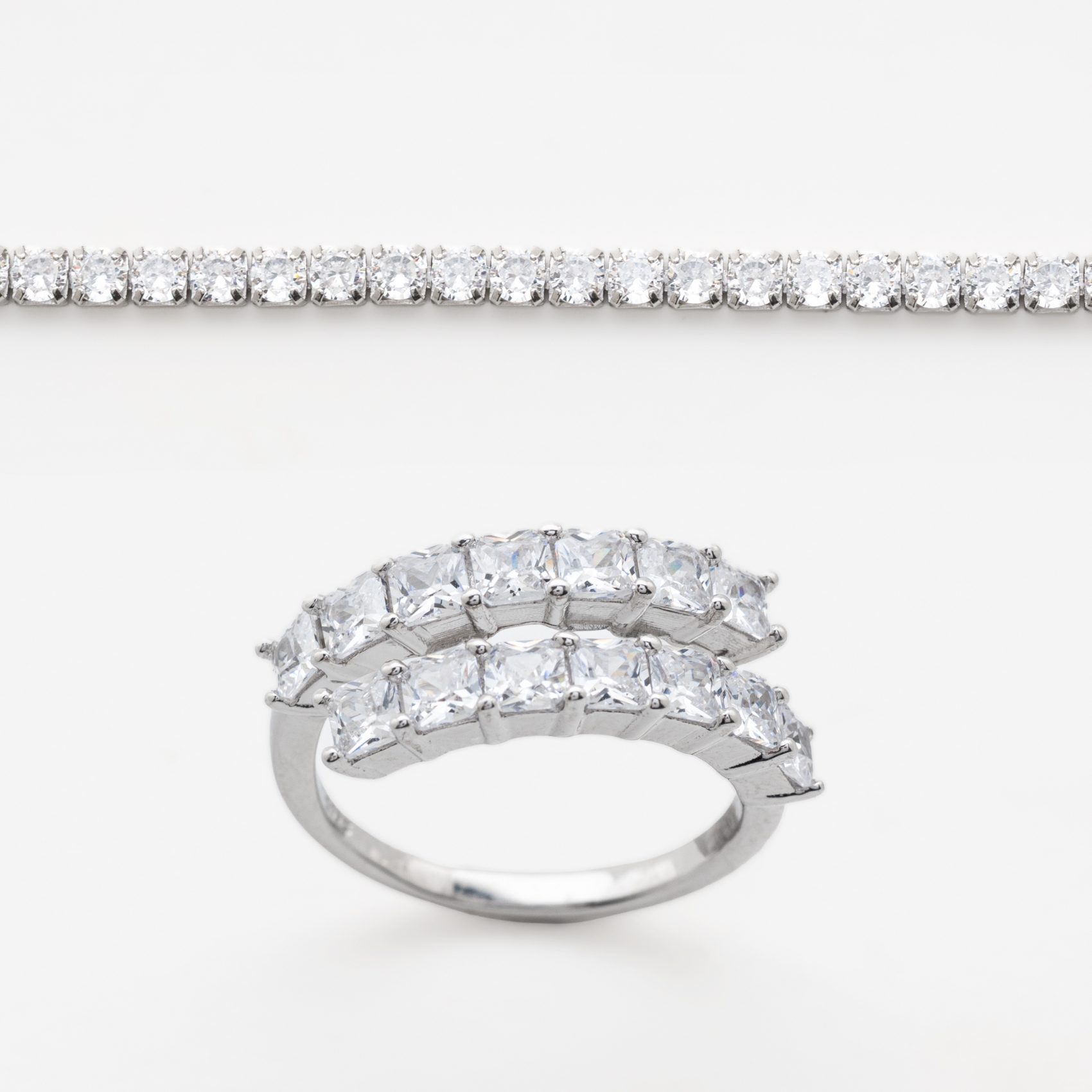 Pulsera rivière y sortija diseño cruzado en plata rodiada con circonitas engastadas en garras.