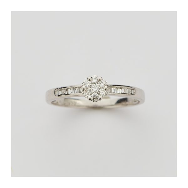 Sortija en oro blanco con rosetón de diamantes talla brillante y brazos de diamantes talla trapecio.