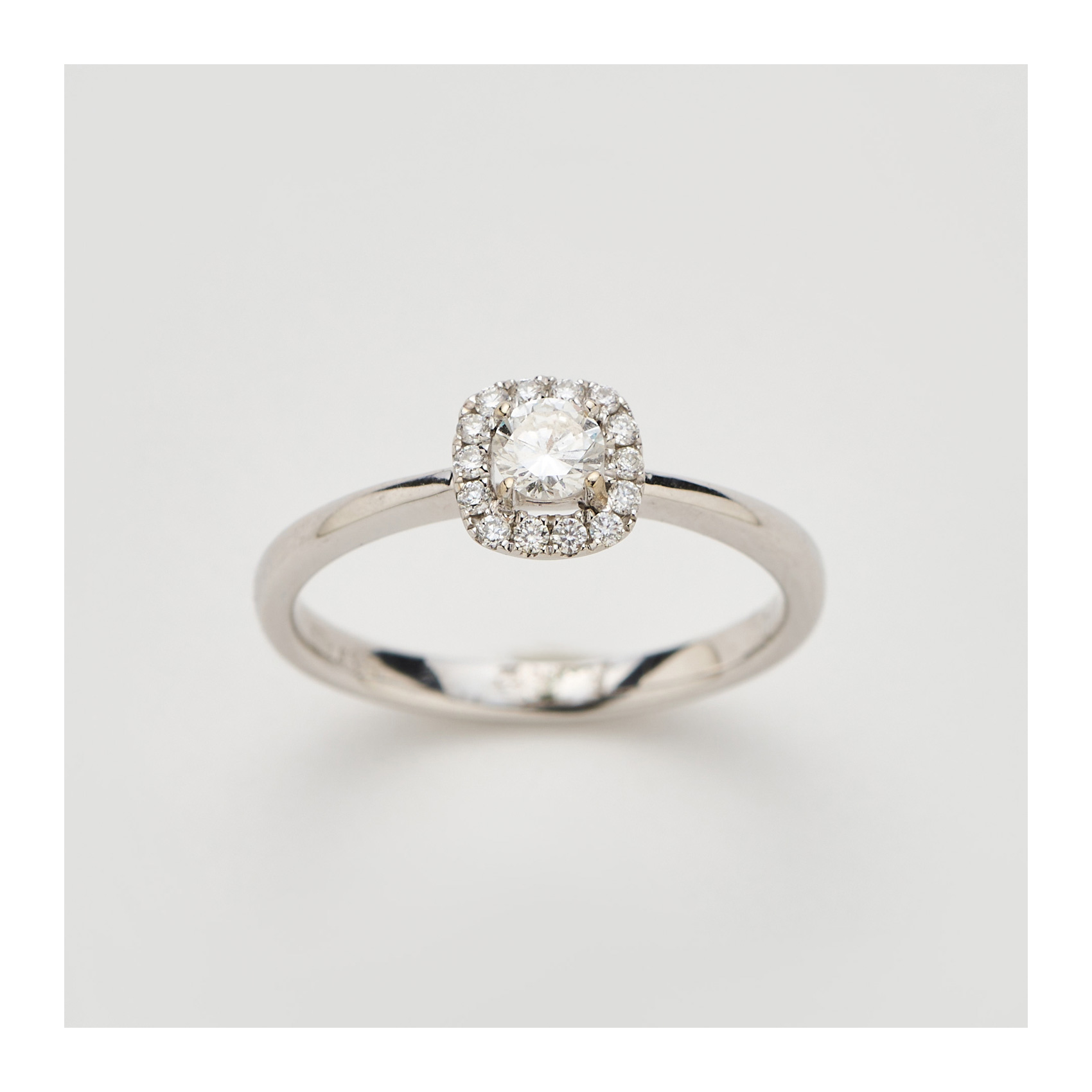 Sortija rosetón en oro blanco con diamantes talla brillante engastados en garras.