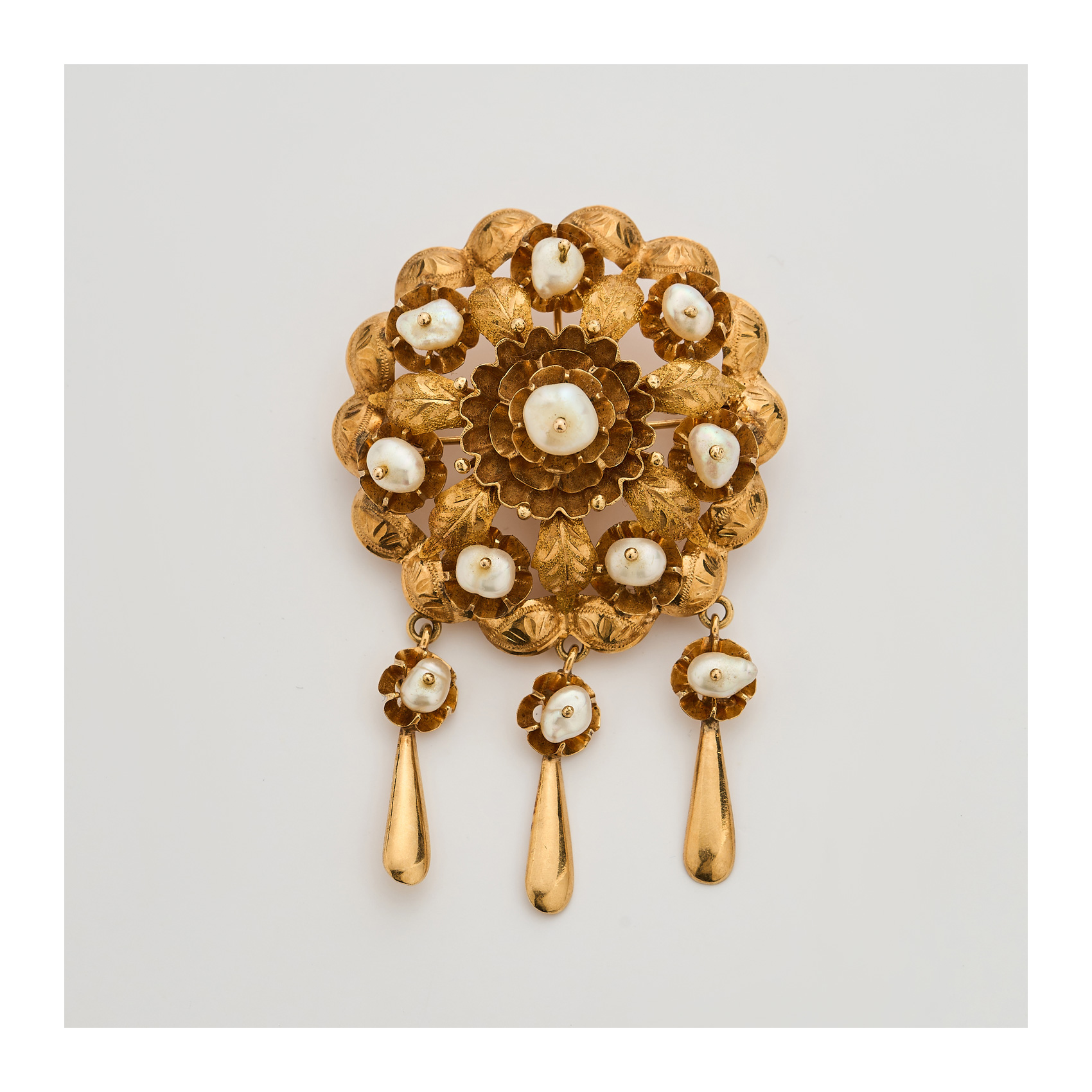 Broche calado estilo isabelino en oro mate y brillo con decoración vegetal y perlas de agua dulce de 4 y 5,5 mm.