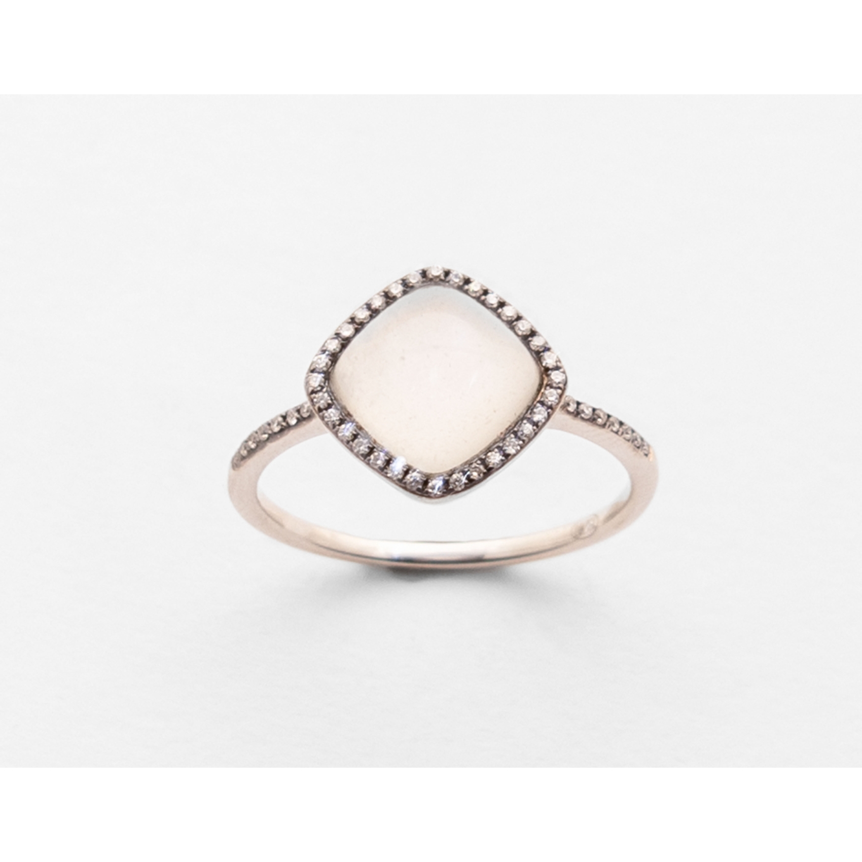 Sortija en oro blanco con cabujón de 7 x 7 mm. y diamantes talla brillante.