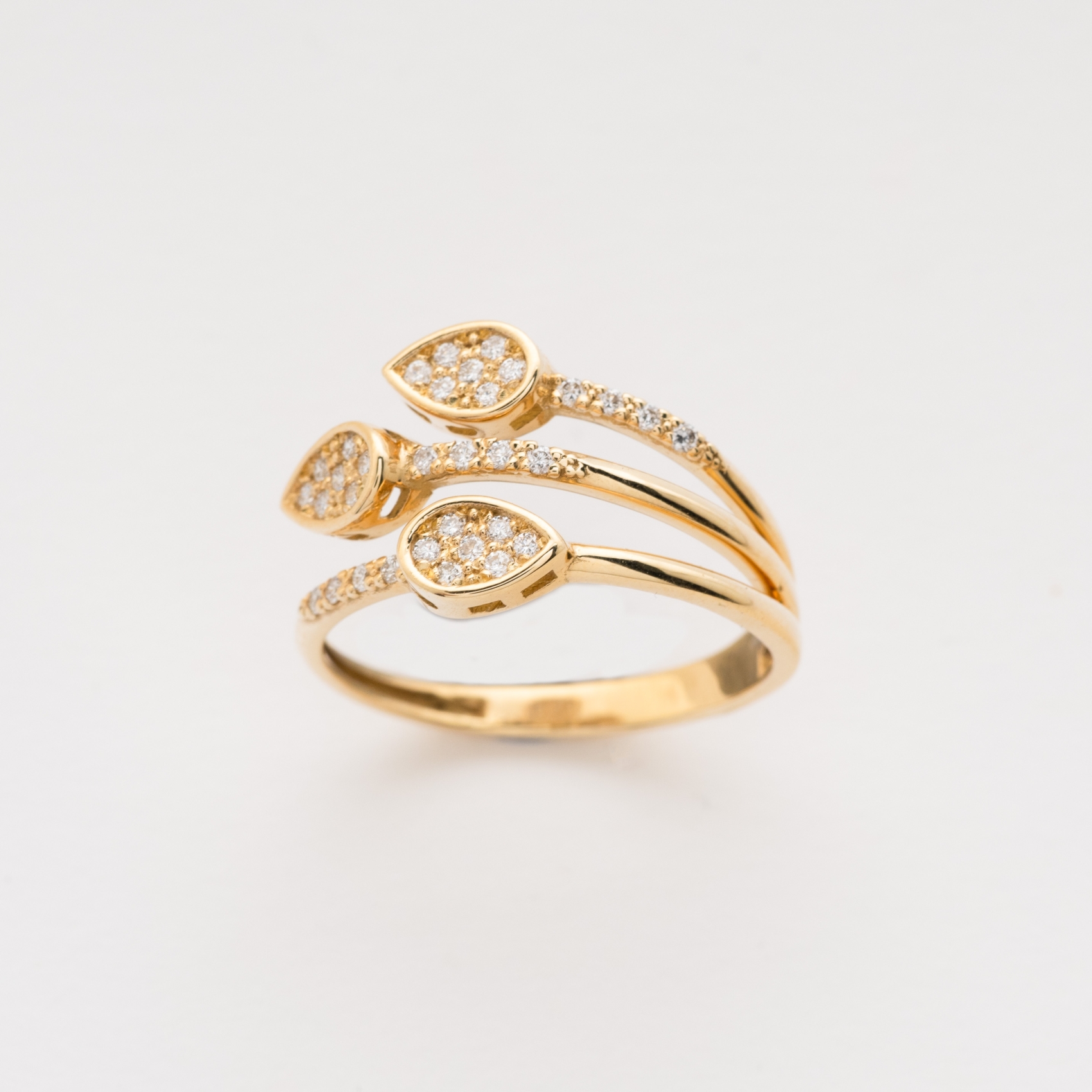 Sortija en oro con centro formado por tres aros rematados por línea y lágrima de diamantes talla brillante.
