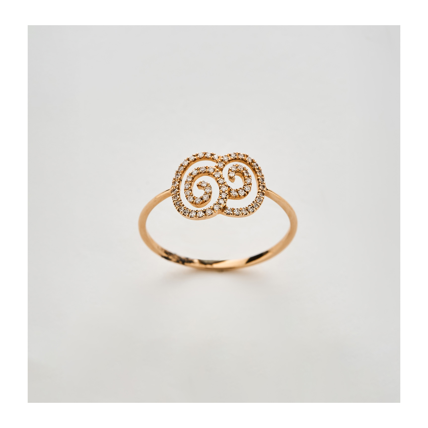 Sortija en oro rosa con centro calado y roleos de diamantes talla brillante.