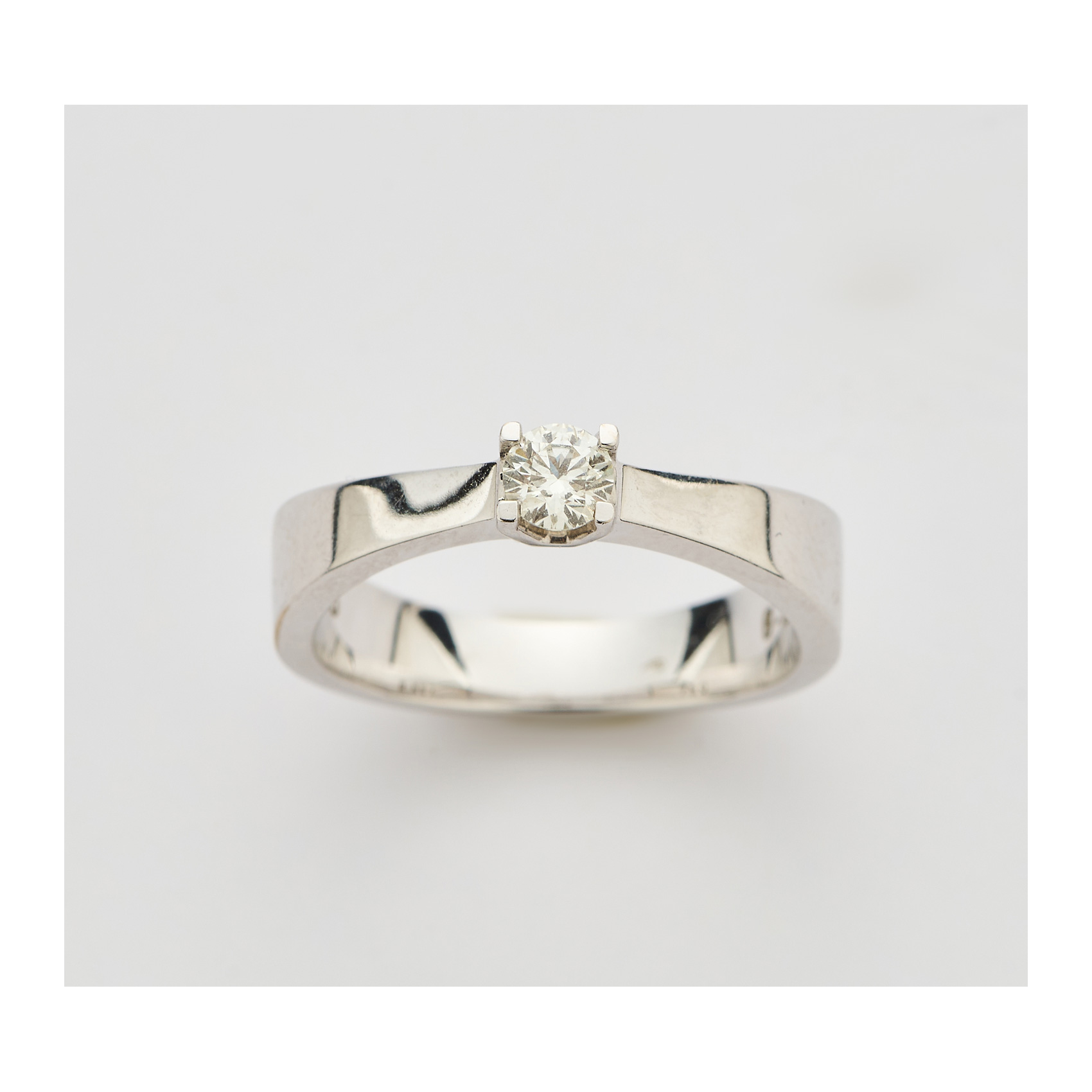 Sortija solitario en oro blanco con diamante talla brillante engastado en garras.