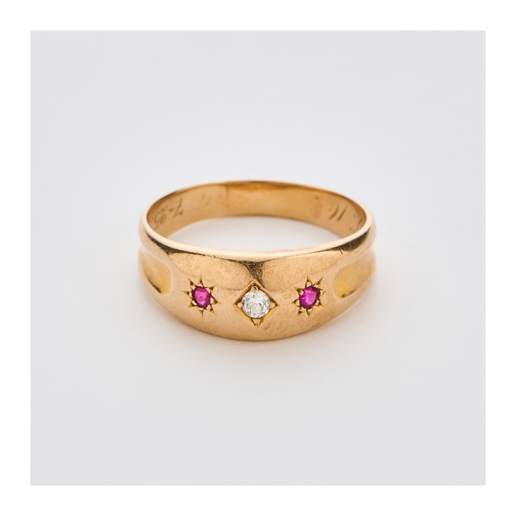 Sortija en oro con diamante talla brillante antigua custodiado por símiles de rubí talla redonda.