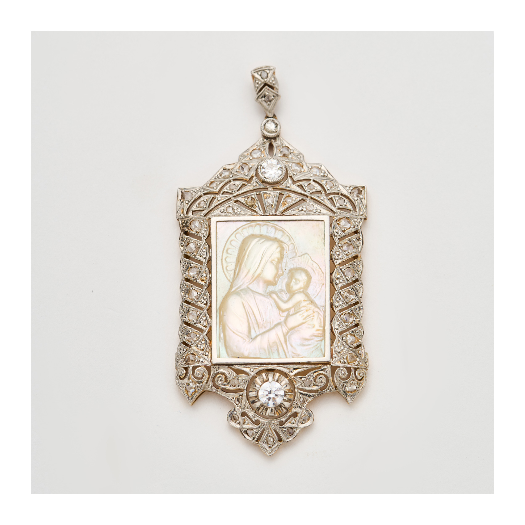 Medalla devocional Art Deco en oro y vistas en platino con representación de Virgen con Niño en nácar y calado de diamantes talla rosa 3/3, c.1930. Los dos diamantes principales han sido sustituídos por circonitas.