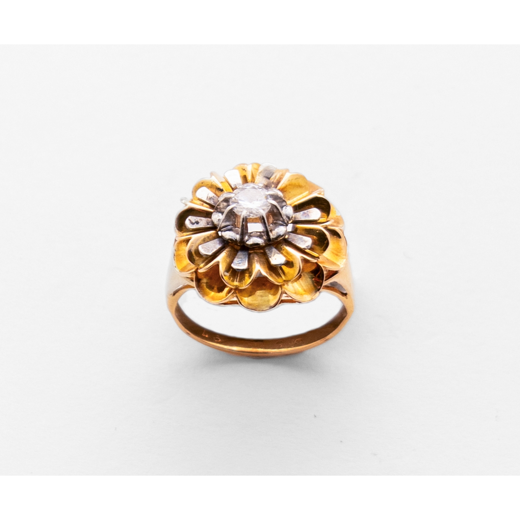Sortija diseño flor en oro bicolor rosa y blanco con diamante talla brillante engastado en garras.