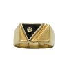 Sortija sello en oro bicolor con aplicación triangular de ónix y diamante talla brillante engastado en chatón. Peso diamante: 0,05 ct. aprox. Peso total: 12,2 gr. Medida: Nº 25. Estimación: 800 – 950 €.