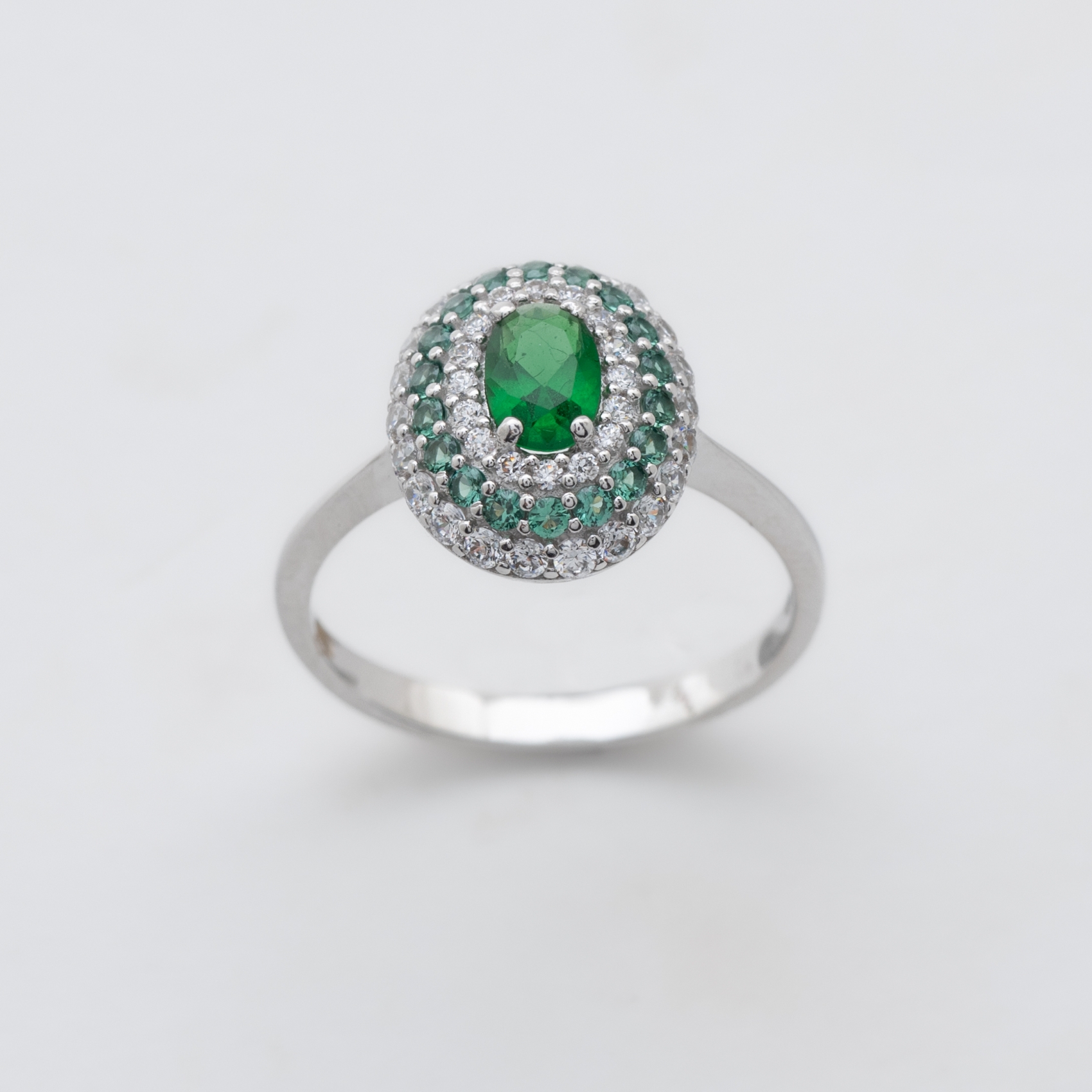 Sortija rosetón en oro blanco con esmeralda central talla oval y orlas de circonitas y esmeraldas talla redonda engastados en garras.