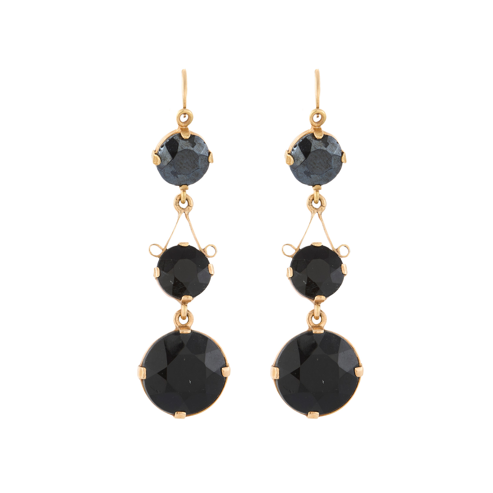 Pendientes largos en oro con tres hematites talla redonda de 7 y 11 mm. engastados en garras, c.1900.