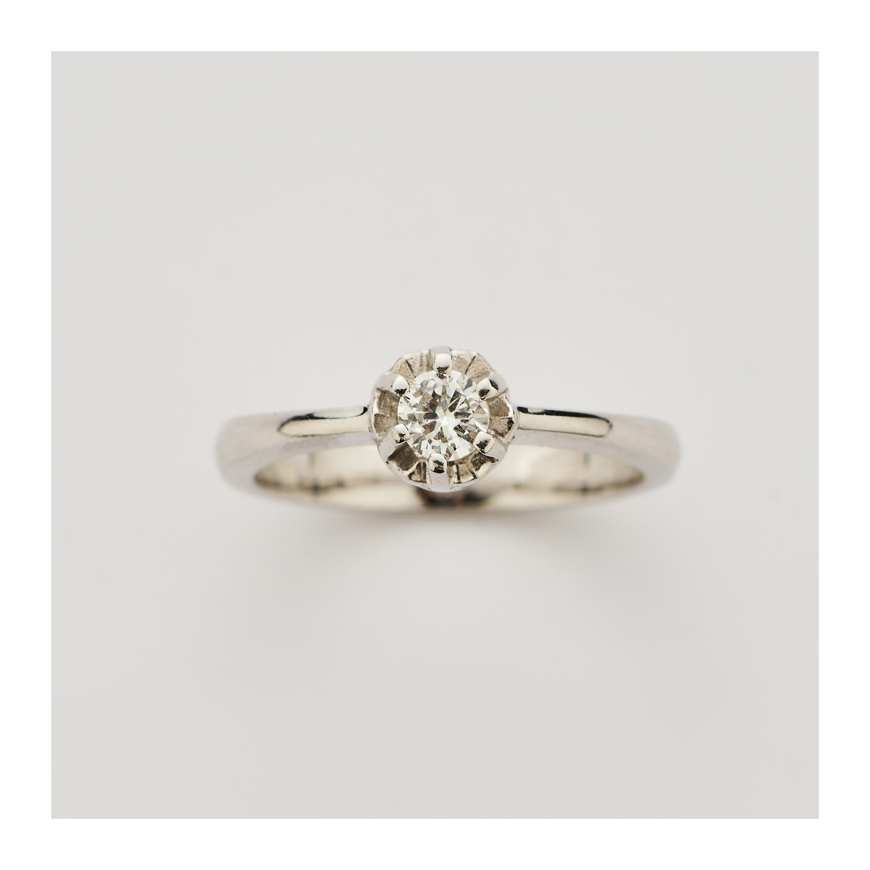 Sortija solitario en oro blanco con diamante talla brillante engastado en garras.