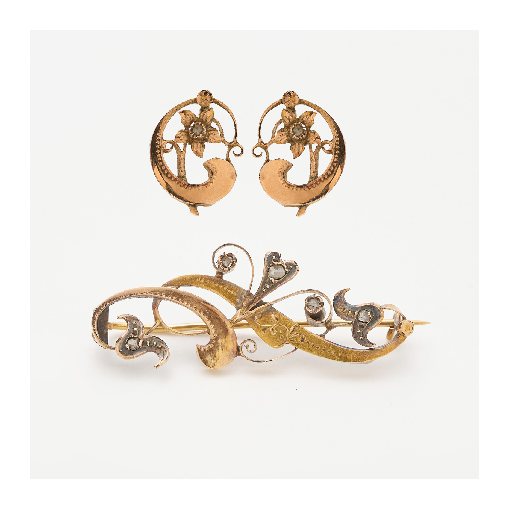 Broche y pendientes modernistas en oro con decoración de motivos florales y diamantes talla rosa 3/3, c.1910.