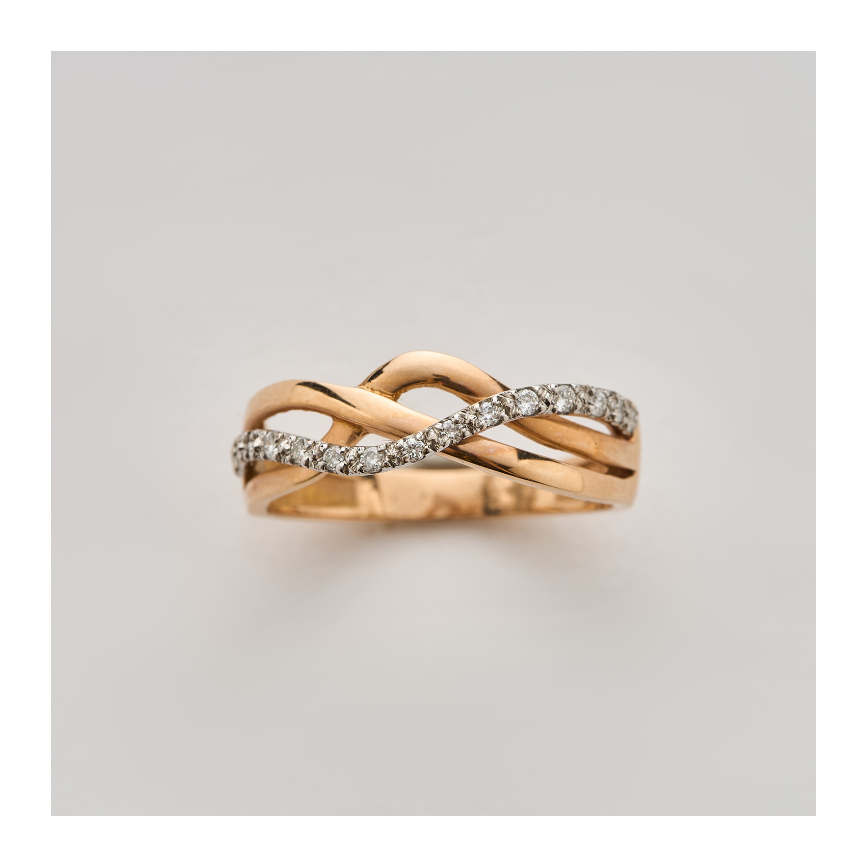 Sortija en oro rosa y blanco con centro cruzado por banda ondulada de diamantes talla brillante.