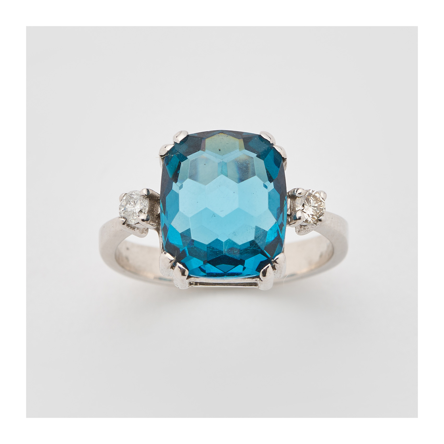 Sortija en oro blanco con cabujón multifacetado de topacio de 12 x 10 mm. custodiado por diamantes talla brillante .